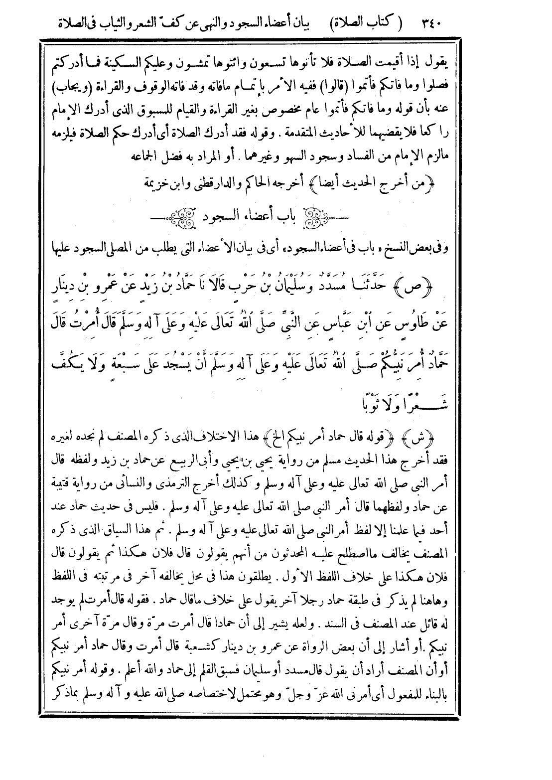 (ص) حَدَّثَنَا مُسَدَّدٌ، وَسُلَيْمَانُ بْنُ حَرْبٍ، قَالَا: نَا حَمَّادُ بْنُ زَيْدٍ، عَنْ عَمْرِو بْنِ دِينَارٍ، عَنْ طَاوُسٍ، عَنِ ابْنِ عَبَّاسٍ، عَنِ النَّبِيِّ صَلَّى اللهُ تَعَالَى عَلَيْهِ وَعَلَى آلِهِ وسَلَّمَ قَالَ: «أُمِرْتُ»، قَالَ حَمَّادٌ: «أُمِرَ نَبِيُّكُمْ صَلَّى اللهُ تَعَالَى عَلَيْهِ وَعَلَى آلِهِ وسَلَّمَ أَنْ يَسْجُدَ عَلَى سَبْعَةٍ، وَلَا يَكُفَّ شَعْرًا، وَلَا ثَوْبًا»