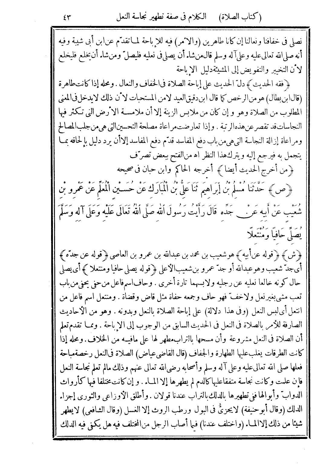 (ص) حَدَّثَنَا مُسْلِمُ بْنُ إِبْرَاهِيمَ، ثَنَا عَلِيُّ بْنُ الْمُبَارَكِ، عَنْ حُسَيْنٍ الْمُعَلِّمِ، عَنْ عَمْرِو بْنِ شُعَيْبٍ، عَنْ أَبِيهِ، عَنْ جَدِّهِ، قَالَ: رَأَيْتُ رَسُولَ اللَّهِ صَلَّى اللهُ تَعَالَى عَلَيْهِ وَعَلَى آلِهِ وسَلَّمَ «يُصَلِّي حَافِيًا وَمُنْتَعِلًا»