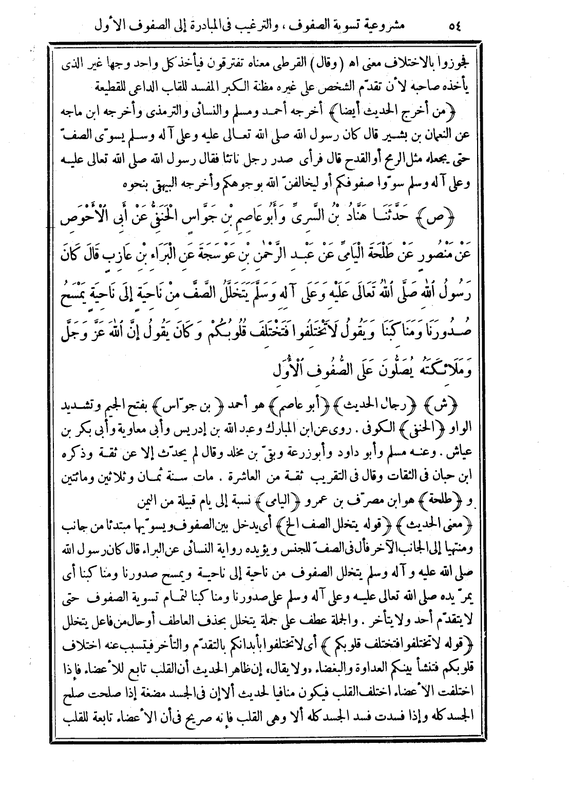 (ص) حَدَّثَنَا هَنَّادُ بْنُ السَّرِيِّ، وَأَبُو عَاصِمِ بْنُ جَوَّاسٍ الْحَنَفِيُّ، عَنْ أَبِي الْأَحْوَصِ، عَنْ مَنْصُورٍ، عَنْ طَلْحَةَ الْيَامِيِّ، عَنْ عَبْدِ الرَّحْمَنِ بْنِ عَوْسَجَةَ، عَنِ الْبَرَاءِ بْنِ عَازِبٍ، قَالَ: كَانَ رَسُولُ اللَّهِ صَلَّى اللهُ تَعَالَى عَلَيْهِ وَعَلَى آلِهِ وسَلَّمَ يَتَخَلَّلُ الصَّفَّ مِنْ نَاحِيَةٍ إِلَى نَاحِيَةٍ يَمْسَحُ صُدُورَنَا وَمَنَاكِبَنَا وَيَقُولُ: «لَا تَخْتَلِفُوا فَتَخْتَلِفَ قُلُوبُكُمْ» وَكَانَ يَقُولُ: «إِنَّ اللَّهَ عَزَّ وَجَلَّ وَمَلَائِكَتَهُ يُصَلُّونَ عَلَى الصُّفُوفِ الْأُوَلِ»