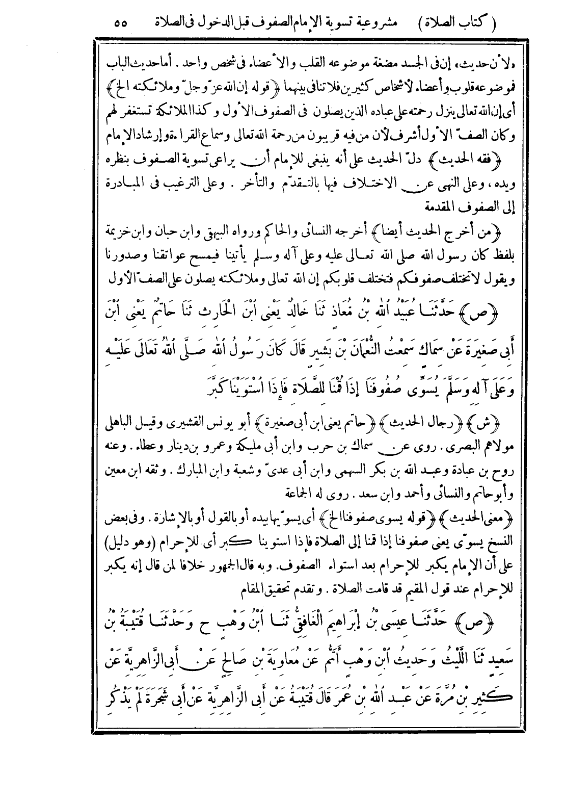 (فقه الحديث) دلّ الحديث على أنه ينبغى للإمام أن يراعي تسوية الصفوف بنظره ويده، وعلى النهى عن الاختلاف فيها بالتقدم والتأخر. وعلى الترغيب في المبادرة إلى الصفوف المقدمة