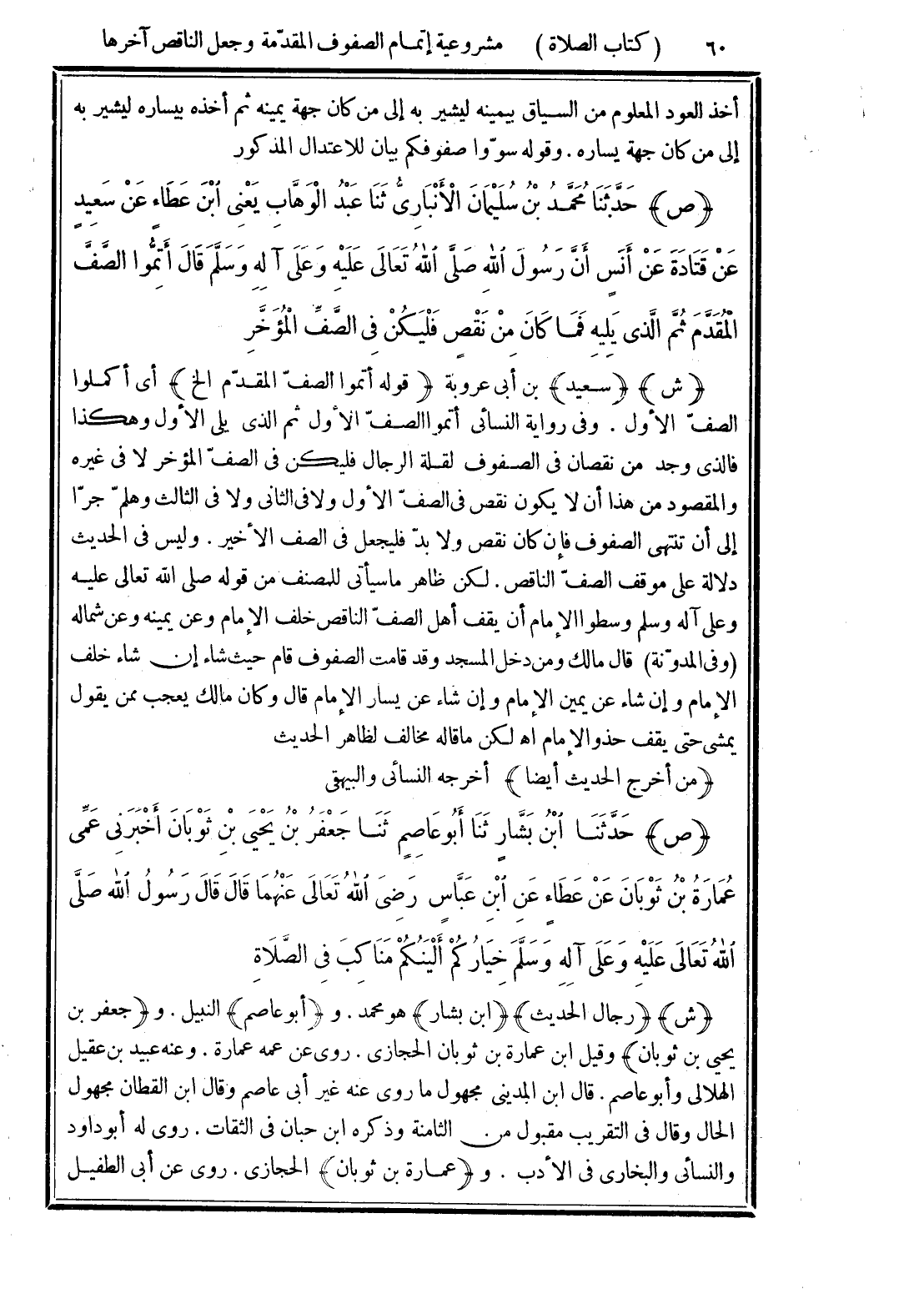 (ص) حَدَّثَنَا مُحَمَّدُ بْنُ سُلَيْمَانَ الْأَنْبَارِيُّ، ثَنَا عَبْدُ الْوَهَّابِ يَعْنِي ابْنَ عَطَاءٍ، عَنْ سَعِيدٍ، عَنْ قَتَادَةَ، عَنْ أَنَسِ، أَنَّ رَسُولَ اللَّهِ صَلَّى اللهُ تَعَالَى عَلَيْهِ وَعَلَى آلِهِ وسَلَّمَ قَالَ: «أَتِمُّوا الصَّفَّ الْمُقَدَّمَ، ثُمَّ الَّذِي يَلِيهِ، فَمَا كَانَ مِنْ نَقْصٍ فَلْيَكُنْ فِي الصَّفِّ الْمُؤَخَّرِ»