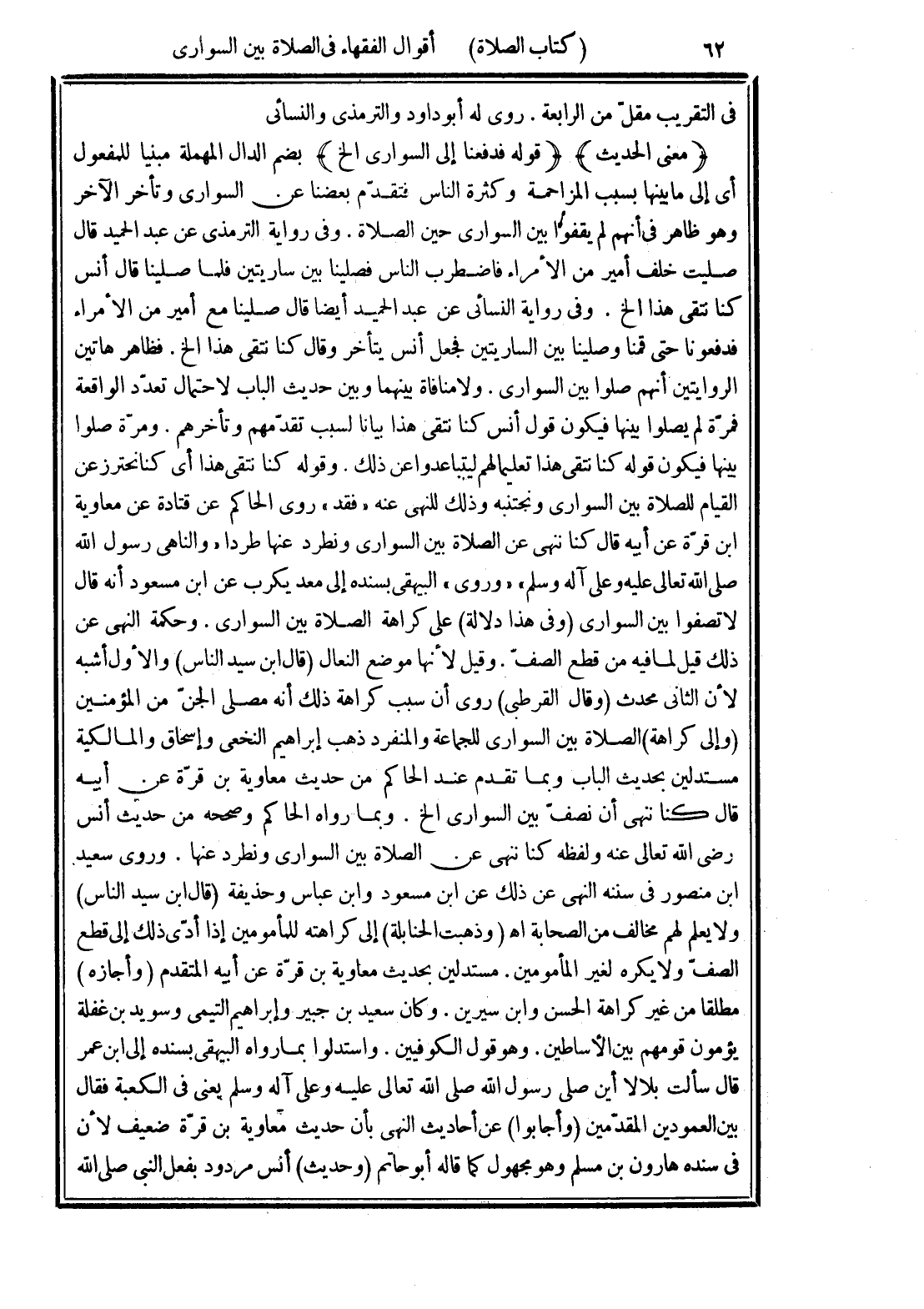 (قوله فدفعنا إلى السوارى الخ) بضم الدال المهملة مبنيا للمفعول أى إلى ما بينها بسبب المزاحمة وكثرة الناس فتقدّم بعضنا عن السوارى وتأخر الآخر وهو ظاهر في أنهم لم يقفوا بين السوارى حين الصلاة. وفي رواية الترمذى عن عبد الحميد قال صليت خلف أمير من الأمراء فاضطرب الناس فصلينا بين ساريتين فلما صلينا قال أنس كنا نتقى هذا الخ. وفي رواية النسائى عن عبد الحميد أيضا قال صلينا مع أمير من الأمراء فدفعونا حتى قمنا وصلينا بين الساريتين فجعل أنس يتأخر وقال كنا نتقى هذا الخ. فظاهر هاتين الروايتين. أنهم صلوا بين السوارى. ولا منافاة بينهما وبين حديث الباب لاحتمال تعدد الواقعة فمرّة لم يصلوا بينها فيكون قول أنس كنا نتقى هذا بيانا لسبب تقدّمهم وتأخرهم. ومرّة صلوا بينها فيكون قوله كنا نتقى هذا تعليما لهم ليتباعدوا عن ذلك. وقوله كنا نتقى هذا أى كنا نحترز عن القيام للصلاة بين السوارى ونجتنبه وذلك للنهى عنه "فقد" روى الحاكم عن قتادة عن معاوية ابن قرة عن أبيه قال كنا ننهى عن الصلاة بين السوارى ونطرد عنها طردا "والناهي رسول الله صلى الله تعالى عليه وعلى آله وسلم" "وروى" البيهقى بسنده إلى معد يكرب عن ابن مسعود أنه قال لا تصفوا بين السوارى (وفي هذا دلالة) على كراهة الصلاة بين السوارى. وحكمة النهى عن ذلك قيل لما فيه من قطع الصفّ. وقيل لأنها موضع النعال (قال ابن سيد الناس) والأول أشبه لأن الثانى محدث (وقال القرطبي) روى أن سبب كراهة ذلك أنه مصلى الجنّ من المؤمنين (وإلى كراهة) الصلاة بين السوارى للجماعة والمنفرد ذهب إبراهيم النخعى وإسحاق والمالكية مستدلين بحديث الباب وبما تقدم عند الحاكم من حديث معاوية بن قرّة عن أبيه قال كنا ننهى أن نصفّ بين السوارى الخ. وبما رواه الحاكم وصححه من حديث أنس رَضِيَ اللَّهُ تَعَالَى عَنْهُ ولفظه كنا ننهى عن الصلاة بين السوارى ونطرد عنها. وروى سعيد ابن منصور في سننه النهى عن ذلك عن ابن مسعود وابن عباس وحذيفة (قال ابن سيد الناس) ولا يعلم لهم مخالف من الصحابة اهـ (وذهبت الحنابلة) إلى كراهته للمأمومين إذا أدّى ذلك إلى قطع الصفّ ولا يكره لغير المأمومين. مستدلين بحديث معاوية بن قرة عن أبيه المتقدم (وأجازه) مطلقا من غير كراهة الحسن وابن سيرين. وكان سعيد بن جبير وإبراهيم التيمى وسويد بن غفلة يؤمون قومهم بين الأساطين. وهو قول الكوفيين. واستدلوا بما رواه البيهقى بسنده إلى ابن عمر قال سألت بلالا أين صلى رسول الله صلى الله تعالى عليه وعلى آله وسلم يعني في الكعبة فقال بين العمودين المقدّمين (وأجابوا) عن أحاديث النهى بأن حديث معاوية بن قرة ضعيف لأن في سنده هارون بن مسلم وهو مجهول كما قاله أبو حاتم (وحديث) أنس مردود بفعل النبى صلى الله