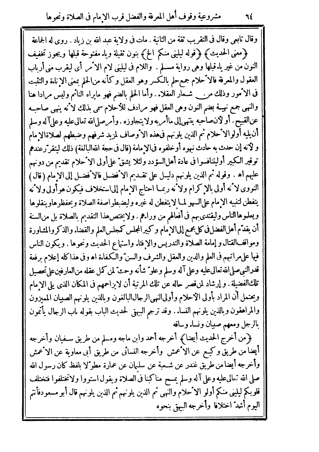 (قوله ليليني منكم الخ) بنون ثقيلة وياء مفتوحة قبلها ويجوز تخفيف النون من غير ياء قبلها وهي رواية مسلم. واللام في ليليني لام الأمر أى ليقرب مني أرباب العقول والمعرفة فالأحلام جمع حلم بالكسر وهو العقل وكأنه من الحلم بمعنى الإناة والتثبت في الأمور وذلك من شعار العقلاء. وأما الحلم بالضم فهو ما يراه النائم وليس مرادا هنا والنهى جمع نهية بضم النون وهي العقل فهو مرادف للأحلام سمى بذلك لأنه ينهى صاحبه عن القبيح. أو لأن صاحبه ينتهى إلى ما أمر به ولا يتجاوزه. وأمر صلى الله تعالى عليه وعلى آله وسلم أن يليه أولو الأحلام ثم الذين يلونهم في هذه الأوصاف لمزيد شرفهم وضبطهم لصلاة الإمام ولأنه إن حدث به حادث نبهوه أو خلفوه في الإمامة (قال في حجة الله البالغة) ذلك ليتقرّر عندهم توقير الكبير أو ليتنافسوا في عادة أهل السؤدد ولئلا يشقّ على أولى الأحلام تقديم من دونهم عليهم اهـ. وقوله ثم الذين يلونهم دليل على تقديم الأفضل فالأفضل إلى الإمام (قال) النووى لأنه أولى بالإكرام ولأنه ربما احتاج الإمام إلى استخلاف فيكون هو أولى ولأنه يتفطن لتنبيه الإمام على السهو لما لا يتفطن له غيره وليضبطوا صفة الصلاة ويحفظوها وينقلوها ويعلموها الناس وليقتدى بهم في أفعالهم من وراءهم. ولا يختص هذا التقديم بالصلاة بل من السنة أن يقدّم أهل الفضل في كل مجمع إلى الإمام وكبير المجلس كمجلس العلم والقضاء والذكر والمشاورة ومواقف القتال وإمامة الصلاة والتدريس والإفتاء واستماع الحديث ونحوها. ويكون الناس فيها على مراتبهم في العلم والدين والعقل والشرف والسن والكفائة اهـ وفي هذا كله إعلام برفعة قدر النيى صلى الله تعالى عليه وعلى آله وسلم وعلو شأنه وحث لمن كمل عقله من العارفين على تحصيل تلك الفضيلة. وإرشاد لمن قصر حاله عن تلك المرتبة أن لا يزاحمهم في المكان الذى يلي الإمام ويحتمل أن المراد بأولى الأحلام وأولى النهى الرجال البالغون وبالذين يلونهم الصبيان المميزون والمراهقون وبالذين يلونهم النساء. وقد ترجم البيهقي لحديث الباب بقوله باب الرجال يأتمون بالرجل ومعهم صبيان ونساء وساقه