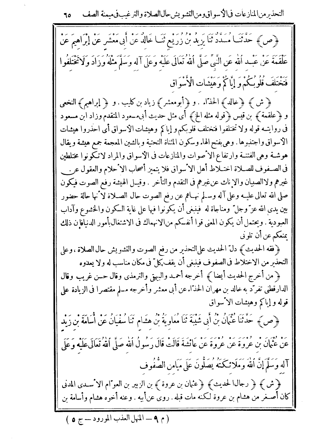 (فقه الحديث) دلّ الحديث على التحذير من رفع الصوت والتشويش حال الصلاة، وعلى التحذير من الاختلاط في الصفوف فينبغى أن يقف كلّ في مكان مناسب له ولا يعدوه