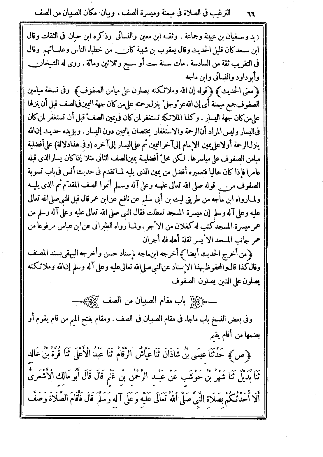 وفي بعض النسخ باب ما جاء في مقام الصبيان في الصف. ومقام بفتح الميم من قام يقوم أو بضمها من أقام يقيم
