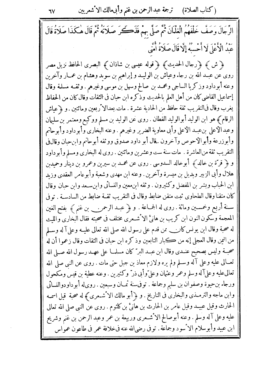 (قوله عيسى بن شاذان) البصرى الحافظ نزيل مصر روى عن عبد الله بن رجاء وعياش بن الوليد وإبراهيم بن سويد وهشام بن عمار وآخرين وعنه أبو داود وزكريا الساجى ومحمد بن صالح وسهل بن موسى وغيرهم. وثقه مسلمة وقال إسماعيل القاضى كان من أهل العلم بالحديث وذكره ابن حبان في الثقات وقال كان من الحفاظ يغرب وقال في التقريب ثقة حافظ من الحادية عشرة. مات بعد الأربعين ومائتين. و (عياش الرقام) هو ابن الوليد أبو الوليد القطان. روى عن الوليد بن مسلم ووكيع ومعتمر بن سليمان وعبد الأعلى بن عبد الأعلى وأبى معاوية الضرير وغيرهم. وعنه البخارى وأبو داود وأبو حاتم وأبو زرعة وأبو الأحوص وآخرون. قال أبو داود صدوق ووثقه أبو حاتم وابن حبان وقال في التقريب ثقة من العاشرة. مات سنة ست وعشرين ومائتين. روى له البخارى ومسلم وأبو داود و (قرّة بن خالد) أبو خالد السدوسى. روى عن محمد بن سيرين وعمرو بن دينار وحميد بن هلال وأبى الزبير وبديل بن ميسرة وآخرين. وعنه ابن مهدى وشعبة وأبو عامر العقدى وزيد ابن الحباب وبشر بن المفضل وكثيرون. وثقه ابن معين والنسائى وابن سعد وابن حبان وقال كان متقنا وقال الطحاوى ثبت متقن ضابط وقال في التقريب ثقة ضابط من السادسة. توفي سنة أربع وخمسين ومائة. روى له الجماعة. و (عبد الرحمن بن غنم) بفتح الغين المعجمة وسكون النون ابن كريب بن هانئ الأشعرى مختلف في صحبته فقال البخارى والليث له صحبة وقال ابن يونس كان ممن قدم على رسول الله صلى الله تعالى عليه وعلى آله وسلم من اليمن وقال العجلى إنه من كبار التابعين وذكره ابن حبان في الثقات وقال زعموا أن له صحبة وليس بصحيح عندى وقال ابن عبد البرّ كان مسلما على عهد رسول الله صلى الله تعالى عليه وعلى آله وسلم ولم يره ولازم معاذ بن جبل حتى مات. روى عن النبي صلى الله تعالى عليه وعلى آله وسلم وعمر وعثمان وعلي وأبى ذرّ وكثيرين. وعنه عطية بن قيس ومكحول ورجاء بن حيوة وصفوان بن سليم وجماعة. توفي سنة ثمان وسبعين. روى له أبو داود والنسائى وابن ماجة والترمذى والبخارى في التاريخ. و (أبو مالك الأشعرى) له صحبة قيل اسمه الحارث وقيل عبيد وقيل عامر بن الحارث بن هانئ بن كلثوم. روى عن النبى صلى الله تعالى عليه وعلى آله وسلم. وعنه أبو صالح الأشعرى وربيعة بن عمر وعبد الرحمن بن غنم وشريح ابن عبيد وأبو سلام الأسود وجماعة. توفى رَضِيَ اللَّهُ تَعَالَى عَنْهُفى خلافة عمر في طاعون عمواس