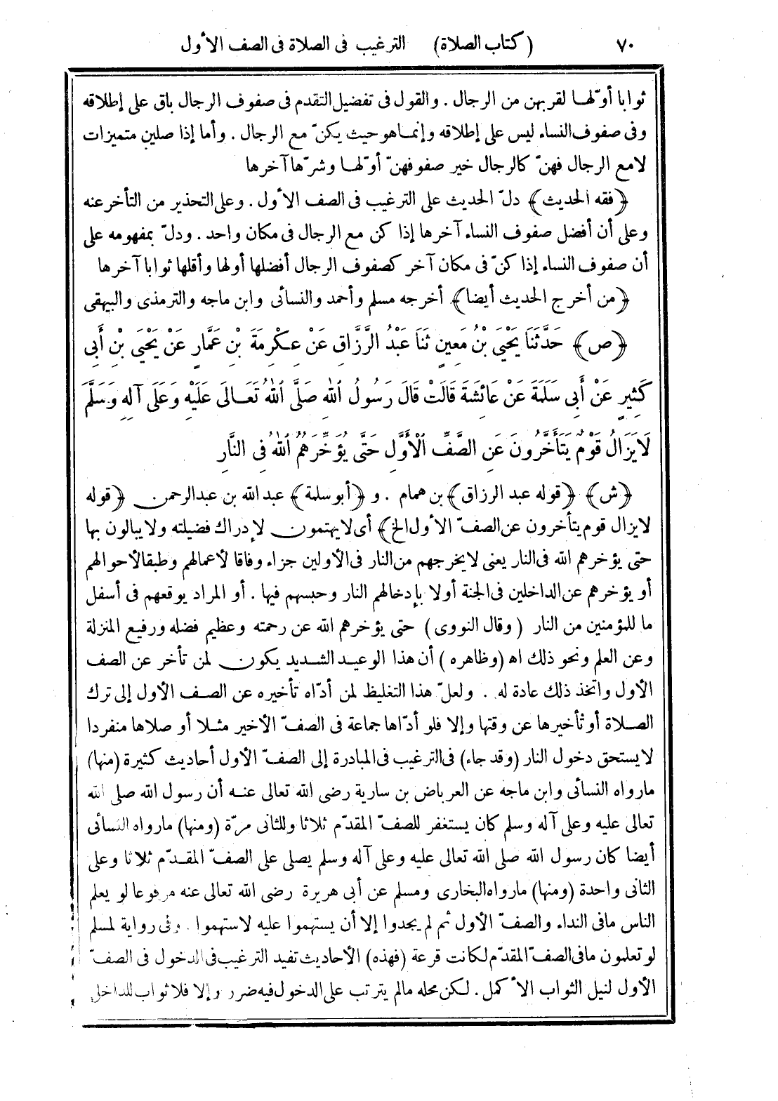 (ص) حَدَّثَنَا يَحْيَى بْنُ مَعِينٍ، ثَنَا عَبْدُ الرَّزَّاقِ، عَنْ عِكْرِمَةَ بْنِ عَمَّارٍ، عَنْ يَحْيَى بْنِ أَبِي كَثِيرٍ، عَنْ أَبِي سَلَمَةَ، عَنْ عَائِشَةَ، قَالَتْ: قَالَ رَسُولُ اللَّهِ صَلَّى اللهُ تَعَالَى عَلَيْهِ وَعَلَى آلِهِ وسَلَّمَ: «لَا يَزَالُ قَوْمٌ يَتَأَخَّرُونَ عَنِ الصَّفِّ الْأَوَّلِ حَتَّى يُؤَخِّرَهُمُ اللَّهُ فِي النَّارِ»
