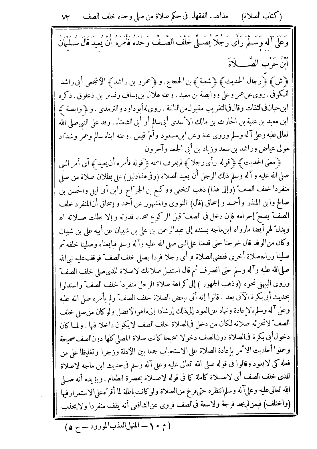وَسَلَّمَ" رَأَى رَجُلًا يُصَلِّي خَلْفَ الصَّفِّ وَحْدَهُ فَأَمَرَهُ أَنْ يُعِيدَ -قَالَ سُلَيْمَانُ بْنُ حَرْبٍ: الصَّلَاةَ-"