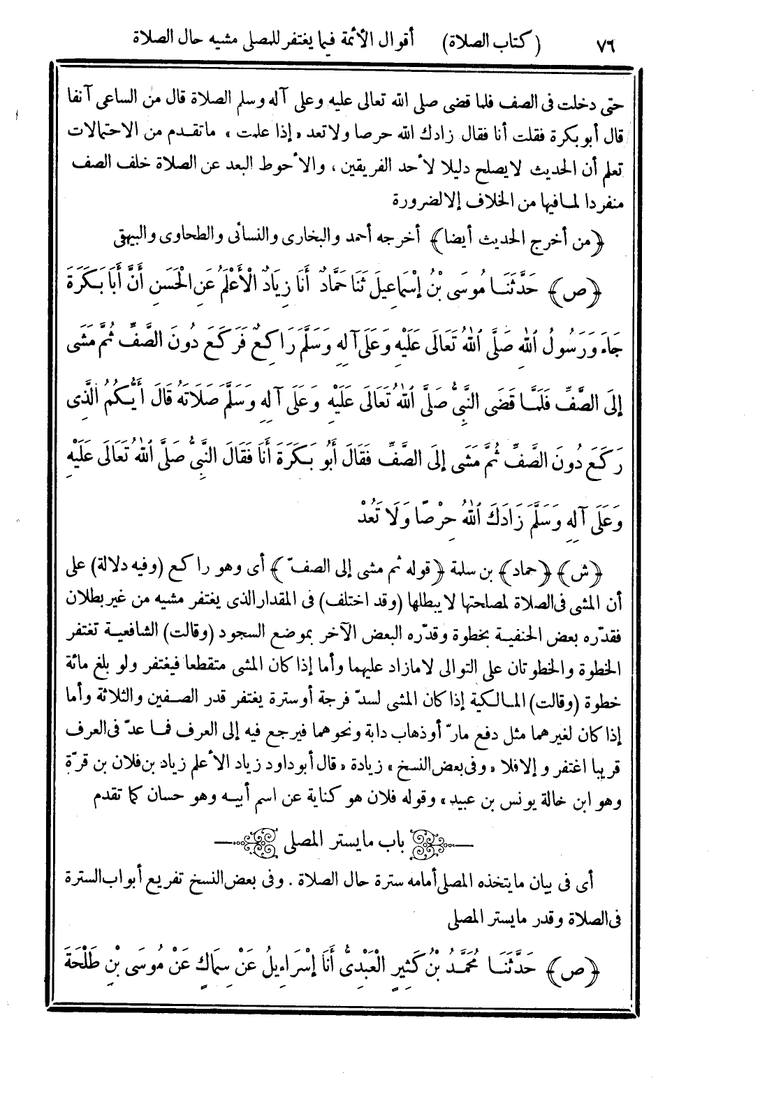 (ص) حَدَّثَنَا مُوسَى بْنُ إِسْمَاعِيلَ، ثَنَا حَمَّادٌ، أَنَا زِيَادٌ الْأَعْلَمُ، عَنِ الْحَسَنِ، أَنَّ أَبَا بَكْرَةَ جَاءَ وَرَسُولُ اللَّهِ - صَلَّى اللهُ عَلَيْهِ وَعَلَى آلِهِ وسَلَّمَ - رَاكِعٌ، فَرَكَعَ دُونَ الصَّفِّ ثُمَّ مَشَى إِلَى الصَّفِّ فَلَمَّا قَضَى النَّبِيُّ صَلَّى اللهُ تَعَالَى عَلَيْهِ وَعَلَى آلِهِ وسَلَّمَ صَلَاتَهُ، قَالَ: «أَيُّكُمُ الَّذِي رَكَعَ دُونَ الصَّفِّ ثُمَّ مَشَى إِلَى الصَّفِّ؟ » فَقَالَ أَبُو بَكْرَةَ: أَنَا، فَقَالَ النَّبِيُّ صَلَّى اللهُ تَعَالَى عَلَيْهِ وَسَلَّمَ: «زَادَكَ اللَّهُ حِرْصًا وَلَا تَعُدْ».
