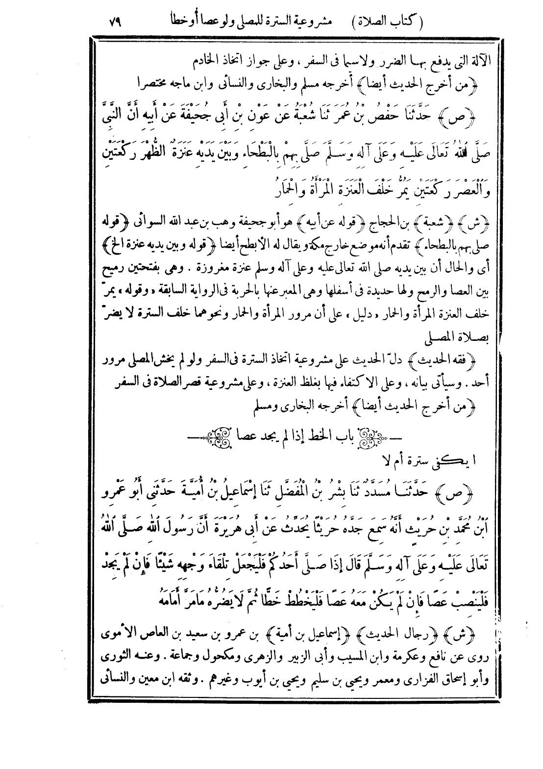 (ص) حَدَّثَنَا حَفْصُ بْنُ عُمَرَ، ثَنَا شُعْبَةُ، عَنْ عَوْنِ بْنِ أَبِي جُحَيْفَةَ، عَنْ أَبِيهِ، أَنَّ النَّبِيَّ صَلَّى اللهُ تَعَالَى عَلَيْهِ وَعَلَى آلِهِ وسَلَّمَ «صَلَّى بِهِمْ بِالْبَطْحَاءِ وَبَيْنَ يَدَيْهِ عَنَزَةٌ الظُّهْرَ رَكْعَتَيْنِ، وَالْعَصْرَ رَكْعَتَيْنِ، يَمُرُّ خَلْفَ الْعَنَزَةِ الْمَرْأَةُ وَالْحِمَارُ»