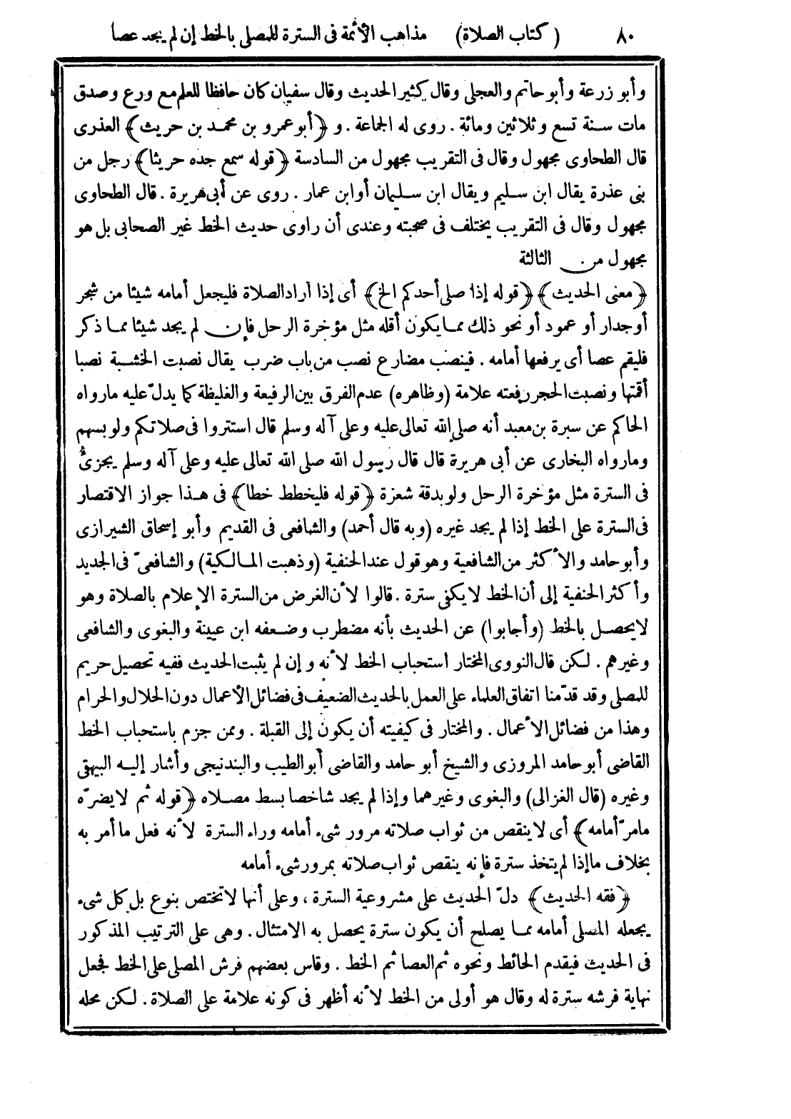 (فقه الحديث) دلّ الحديث على مشروعية السترة، وعلى أنها لا تختص بنوع بل كل شيء يجعله المصلى أمامه مما يصلح أن يكون سترة يحصل به الامتثال. وهي على الترتيب المذكور في الحديث فيقدم الحائط ونحوه ثم العصا ثم الخط. وقاس بعضهم فرش المصلى على الخط فجعل نهاية فرشه سترة له وقال هو أولى من الخط لأنه أظهر في كونه علامة على الصلاة. لكن محله