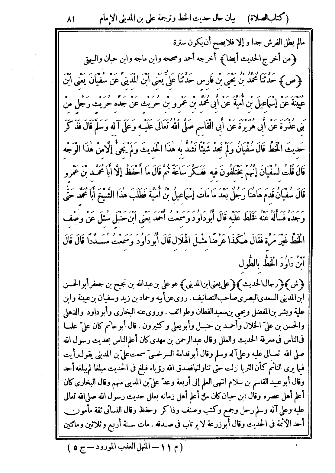 (ص) حَدَّثَنَا مُحَمَّدُ بْنُ يَحْيَى بْنِ فَارِسٍ، حَدَّثَنَا عَلِيٌّ يَعْنِي ابْنَ الْمَدِينِيِّ، عَنْ سُفْيَانَ، يعني ابن عيينة عَنْ إِسْمَاعِيلَ بْنِ أُمَيَّةَ، عَنْ أَبِي مُحَمَّدِ بْنِ عَمْرِو بْنِ حُرَيْثٍ، عَنْ جَدِّهِ حُرَيْثٍ، رَجُلٍ مِنْ بَنِي عُذْرَةَ، عَنْ أَبِي هُرَيْرَةَ، عَنْ أَبِي الْقَاسِمِ صَلَّى اللهُ تَعَالَى عَلَيْهِ وَعَلَى آلِهِ وسَلَّمَ، قَالَ: فَذَكَرَ حَدِيثَ الْخَطِّ، قَالَ سُفْيَانُ: لَمْ نَجِدْ شَيْئًا نَشُدُّ بِهِ هَذَا الْحَدِيثَ، وَلَمْ يَجِئْ إِلَّا مِنْ هَذَا الْوَجْهِ، قَالَ: قُلْتُ لِسُفْيَانَ: إِنَّهُمْ يَخْتَلِفُونَ فِيهِ فَفَكَّرَ سَاعَةً، ثُمَّ قَالَ: مَا أَحْفَظُ إِلَّا أَبَا مُحَمَّدِ بْنَ عَمْرٍو، قَالَ سُفْيَانُ: قَدِمَ هَاهُنَا رَجُلٌ بَعْدَ مَا مَاتَ إِسْمَاعِيلُ بْنُ أُمَيَّةَ فَطَلَبَ هَذَا الشَّيْخُ أَبَا مُحَمَّدٍ حَتَّى وَجَدَهُ فَسَأَلَهُ عَنْهُ فَخَلَطَ عَلَيْهِ، قَالَ أَبُو دَاوُدَ: "وسَمِعْت أَحْمَدَ يعني بْنَ حَنْبَلٍ سُئِلَ عَنْ وَصْفِ الْخَطِّ غَيْرَ مَرَّةٍ، فَقَالَ: هَكَذَا عَرْضًا مِثْلَ الْهِلَالِ"، قَالَ أَبُو دَاوُدَ: "وسَمِعْت مُسَدَّدًا، قَالَ: قَالَ ابْنُ دَاوُدَ: الْخَطُّ بِالطُّولِ".