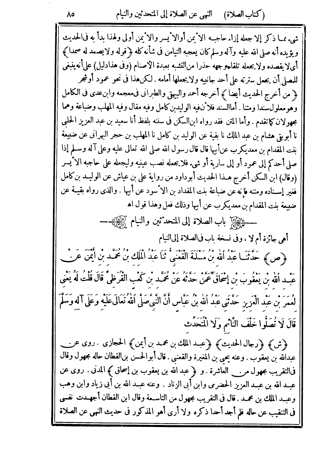(ص) حَدَّثَنَا عَبْدُ اللَّهِ بْنُ مَسْلَمَةَ الْقَعْنَبِيُّ، ثَنَا عَبْدُ الْمَلِكِ بْنُ مُحَمَّدِ بْنِ أَيْمَنَ، عَنْ عَبْدِ اللَّهِ بْنِ يَعْقُوبَ بْنِ إِسْحَاقَ، عَمَّنْ حَدَّثَهُ عَنْ مُحَمَّدِ بْنِ كَعْبٍ الْقُرَظِيِّ، قَالَ: قُلْتُ لَهُ: يَعْنِي لِعُمَرَ بْنِ عَبْدِ الْعَزِيزِ، حَدَّثَنِي عَبْدُ اللَّهِ بْنُ عَبَّاسٍ، أَنَّ النَّبِيَّ صَلَّى اللهُ تَعَالَى عَلَيْهِ وَعَلَى آلِهِ وسَلَّمَ قَالَ: «لَا تُصَلُّوا خَلْفَ النَّائِمِ وَلَا الْمُتَحَدِّثِ»