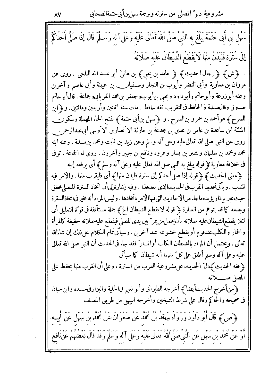 سَهْلِ بْنِ أَبِي حَثْمَةَ، يَبْلُغُ بِهِ النَّبِيَّ صَلَّى اللهُ تَعَالَى عَلَيْهِ وَعَلَى آلِهِ وسَلَّمَ قَالَ: «إِذَا صَلَّى أَحَدُكُمْ إِلَى سُتْرَةٍ فَلْيَدْنُ مِنْهَا لَا يَقْطَعُ الشَّيْطَانُ عَلَيْهِ صَلَاتَهُ».