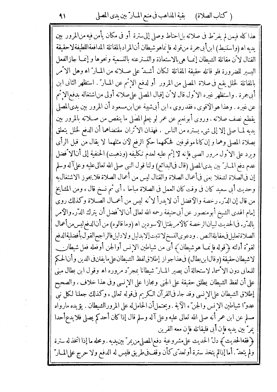 هذا كله فيمن لم يفرّط في صلاته بل احتاط وصلى إلى سترة أو في مكان يأمن فيه من المرور بين يديه اهـ (واستنبط) ابن أبى جمرة من قوله فإنما هو شيطان أن المراد بالمقاتلة المدافعة اللطيفة لا حقيقة القتال لأن مقاتلة الشيطان إنما هى بالاستعاذة والتستر عنه بالتسمية ونحوها وإنما جاز الفعل اليسير للضرورة فلو قاتله حقيقة المقاتلة لكان أشد على صلاته من المار اهـ وهل الأمر بالمقاتلة لخلل يقع في صلاة المصلى من المرور أو لدفع الإثم عن المارّ. استظهر الثاني ابن أبى جمرة. واستظهر غيره الأول قال لأن إقبال المصلى على صلاته أولى من اشتغاله بدفع الإثم عن غيره. وهذا هو الأقوى "فقد روى" ابن أبى شيبة عن ابن مسعود أن المرور بين يدى المصلى يقطع نصف صلاته، وروى أبو نعيم عن عمر لو يعلم المصلى ما ينقص من صلاته بالمرور بين يديه لما صلى إلا إلى شيء يستره من الناس، فهذان الأثران مقتضاهما أن الدفع لخلل يتعلق بصلاة المصلى وهما وإن كانا موقوفين فحكمهما حكم الرفع لأن مثلهما لا يقال من قبل الرأى ويرد على الأول مرور الصبي فإنه لا إثم عليه لعدم تكليفه (وذهبت) الحنفية إلى أن الأفضل عدم دفع المار بين يدى المصلى (قال في البدائع) ولنا قول النبى صلى الله تعالى عليه وعلى آله وسلم إن في الصلاة لشغلا يعنى في أعمال الصلاة والقتال ليس من أعمال الصلاة فلا يجوز الاشتغال به وحديث أبى سعيد كان في وقت كان العمل في الصلاة مباحا "أى ثم نسخ قال" ومن المشايخ من قال إن الدّرء رخصة والأفضل أن لا يدرأ لأنه ليس من أعمال الصلاة وكذلك روى إمام الهدى الشيخ أبو منصور عن أبى حنيفة رحمه الله تعالى أن الأفضل أن يترك الدرء والأمر بالذرء في الحديث لبيان الرخصة كالأمر بقتل الأسودين اهـ (وما قالوه) من أن الدفع ليس من أعمال الصلاة تعليل في مقابلة النص. ودعوى النسخ لا تثبت إلا بدليل ولا دليل فالراجح القول بأفضلية الدفع لقوة أدلته