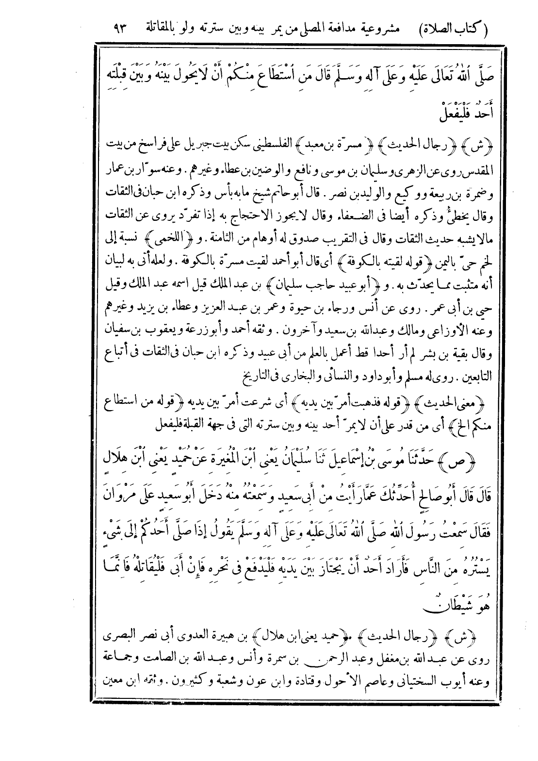 (ص) حَدَّثَنَا مُوسَى بْنُ إِسْمَاعِيلَ، ثَنَا سُلَيْمَانُ يَعْنِي ابْنَ الْمُغِيرَةِ، عَنْ حُمَيْدٍ يَعْنِي ابْنَ هِلَالٍ، قَالَ: قَالَ أَبُو صَالِحٍ: أُحَدِّثُكَ عَمَّا رَأَيْتُ مِنْ أَبِي سَعِيدٍ، وَسَمِعْتُهُ مِنْهُ دَخَلَ أَبُو سَعِيدٍ عَلَى مَرْوَانَ، فَقَالَ: سَمِعْتُ رَسُولَ اللَّهِ صَلَّى اللهُ تَعَالَى عَلَيْهِ وَعَلَى آلِهِ وسَلَّمَ يَقُولُ: «إِذَا صَلَّى أَحَدُكُمْ إِلَى شَيْءٍ يَسْتُرُهُ مِنَ النَّاسِ فَأَرَادَ أَحَدٌ أَنْ يَجْتَازَ بَيْنَ يَدَيْهِ فَلْيَدْفَعْ فِي نَحْرِهِ فَإِنْ أَبَى فَلْيُقَاتِلْهُ فَإِنَّمَا هُوَ الشَّيْطَانُ»