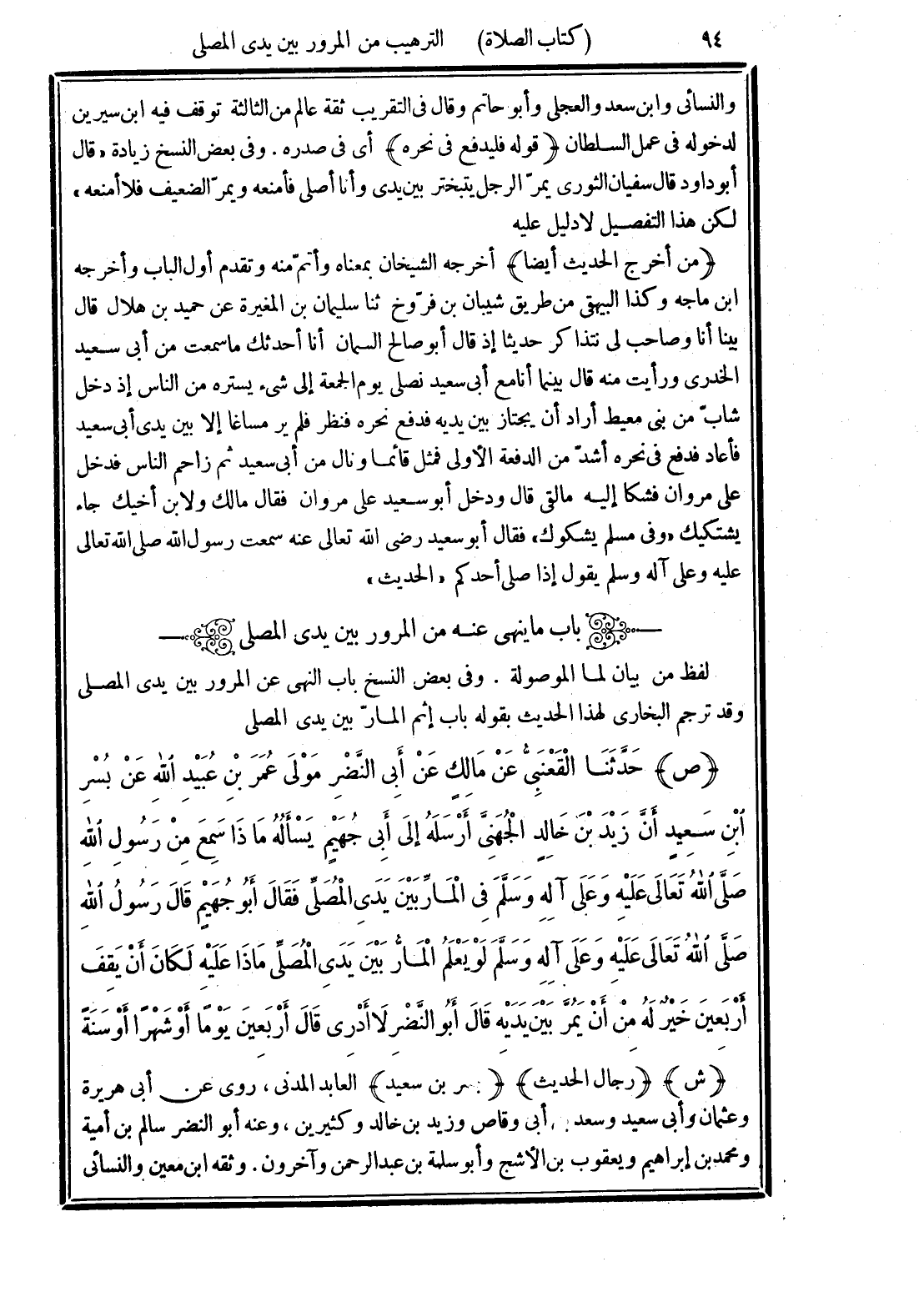 (ص) حَدَّثَنَا الْقَعْنَبِيُّ، عَنْ مَالِكٍ، عَنْ أَبِي النَّضْرِ، مَوْلَى عُمَرَ بْنِ عُبَيْدِ اللَّهِ، عَنْ بُسْرِ بْنِ سَعِيدٍ، أَنَّ زَيْدَ بْنَ خَالِدٍ الْجُهَنِيَّ، أَرْسَلَهُ إِلَى أَبِي جُهَيْمٍ يَسْأَلُهُ مَاذَا سَمِعَ مِنْ رَسُولِ اللَّهِ صَلَّى اللهُ تَعَالَى عَلَيْهِ وَعَلَى آلِهِ وسَلَّمَ فِي الْمَارِّ بَيْنَ يَدَيِ الْمُصَلِّي؟ فَقَالَ أَبُو جُهَيْمٍ: قَالَ رَسُولُ اللَّهِ صَلَّى اللهُ تَعَالَى عَلَيْهِ وَعَلَى آلِهِ وسَلَّمَ: «لَوْ يَعْلَمُ الْمَارُّ بَيْنَ يَدَيِ الْمُصَلِّي مَاذَا عَلَيْهِ لَكَانَ أَنْ يَقِفَ أَرْبَعِينَ خَيْرٌ لَهُ مِنْ أَنْ يَمُرَّ بَيْنَ يَدَيْهِ» قَالَ أَبُو النَّضْرِ: لَا أَدْرِي قَالَ: أَرْبَعِينَ يَوْمًا أَوْ شَهْرًا أَوْ سَنَةً