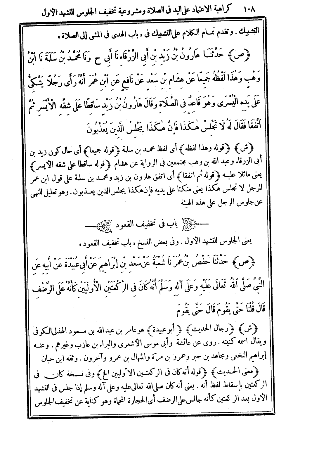 (ص) حَدَّثَنَا هَارُونُ بْنُ زَيْدِ بْنِ أَبِي الزَّرْقَاءِ نَا أَبِي ح وَنَا مُحَمَّدُ بْنُ سَلَمَةَ نَا ابْنُ وَهْبٍ -وَهَذَا لَفْظُهُ- جَمِيعًا عَنْ هِشَامِ بْنِ سَعْدٍ عَنْ نَافِعٍ عَنِ ابْنِ عُمَرَ أَنَّهُ رَأَى رَجُلًا يَتَّكِئُ عَلَى يَدِهِ الْيُسْرَى وَهُوَ قَاعِدٌ فِي الصَّلاَةِ -وَقَالَ هَارُونُ بْنُ زَيْدٍ سَاقِطًا عَلَى شِقِّهِ الأَيْسَرِ ثُمَّ اتَّفَقَا- فَقَالَ لَهُ لاَ تَجْلِسْ هَكَذَا فَإِنَّ هَكَذَا يَجْلِسُ الَّذِينَ يُعَذَّبُونَ.