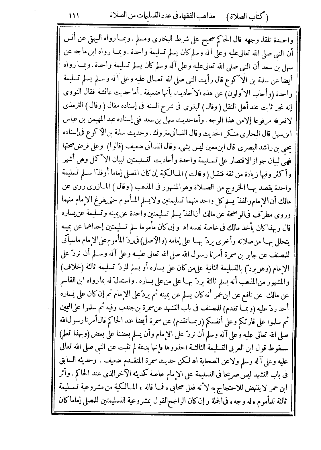 واحدة تلقاء وجهه قال الحاكم صحيح على شرط البخاري ومسلم. وبما رواه البيهقي عن أنس أن النبي صلى الله تعالى عليه وعلى آله وسلم كان يسلم تسليمة واحدة. وبما رواه ابن ماجه عن سهل بن سعد أن النبي صلى الله تعالى عليه وعلى آله وسلم كان يسلم تسليمة واحدة. وبما رواه أيضًا عن سلمة بن الأكوع قال رأيت النبي صلى الله تعالى عليه وعلى آله وسلم يسلم تسليمة واحدة (وأجاب الأولون) عن هذه الأحاديث بأنها ضعيفة. أما حديث عائشة فقال النووي إنه غير ثابت عند أهل النقل (وقال) البغوي في شرح السنة في إسناده مقال (وقال) الترمذي لا نعرفه مرفوعًا إلا من هذا الوجه. وأما حديث سهل بن سعد ففي إسناده عبد المهيمن بن عباس ابن سهل قال البخاري منكر الحديث وقال النتسائى متروك. وحديث سلمة بن الأكوع في إسناده يحيى بن راشد البصري قال ابن معين ليس بشيء وقال النسائي ضعيف (قالوا) وعلى فرض صحتها فهي لبيان جواز الاقتصار على تسليمة واحدة وأحاديث التسليمتين لبيان الأكمل وهي أشهر وأكثر وفيها زيادة من ثقة فتقبل (وقالت) المالكية إن كان المصلي إمامًا أو فذّا سلم تسليمة واحدة يقصد بها الخروج من الصلاة وهو المشهور في المذهب