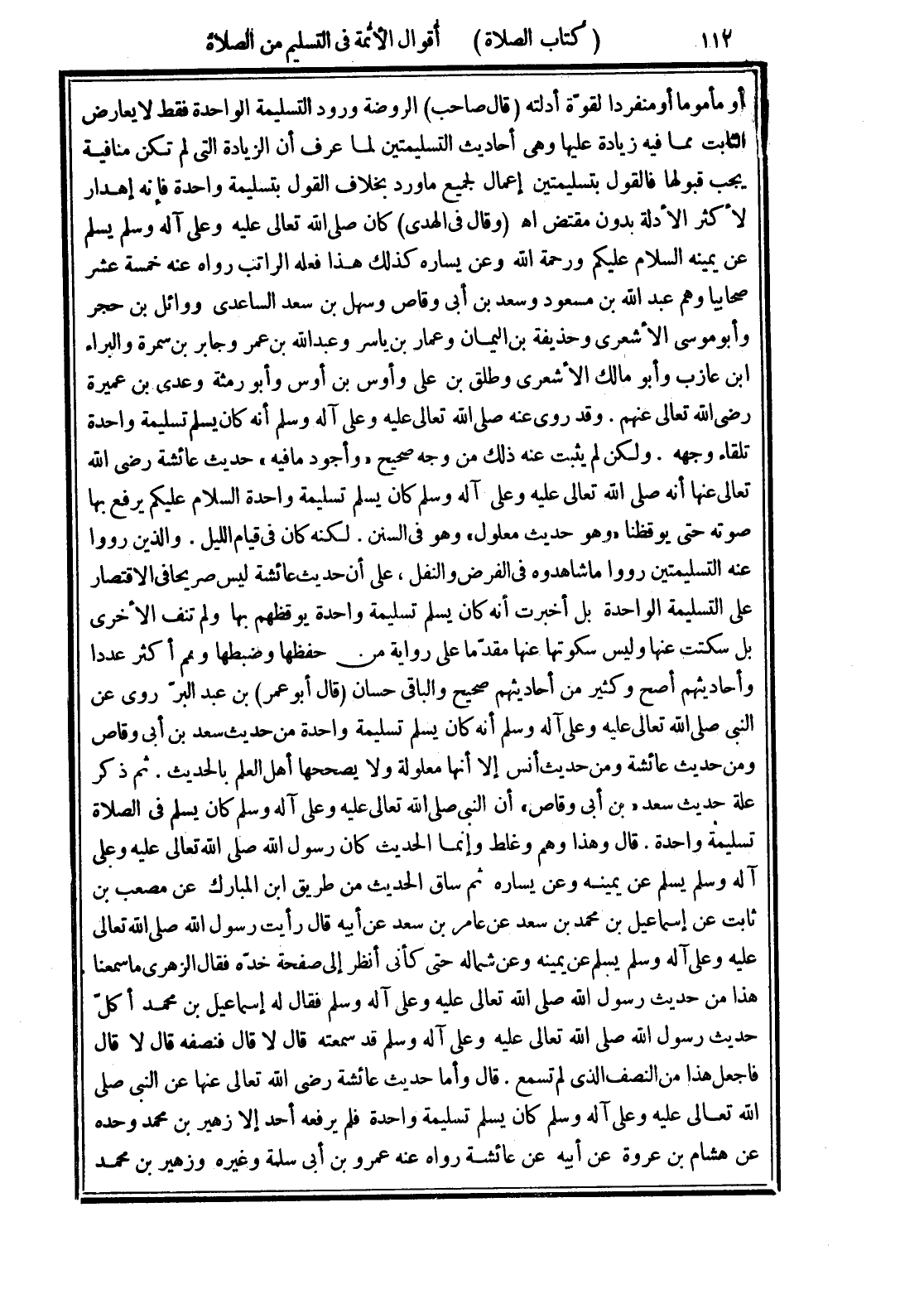 (قال أبو عمر) بن عبد البرّ روى عن النبي صلى الله تعالى عليه وعلى آله وسلم أنه كان يسلم تسليمة وَاحدة من حديث سعد بن أبي وقاص ومن حديث عائشة ومن حديث أنس إلا أنها معلولة ولا يصححها أهل العلم بالحديث. ثم ذكر علة حديث سعد "بن أبي وقاص" أن النبي صلى الله تعالى عليه وعلى آله وسلم كان يسلم في الصلاة تسليمة وَاحدة. قال وهذا وهم وغلط وإنما الحديث كان رسول الله على الله تعالى عليه وعلى آله وسلم يسلم عن يمينه وعن يساره ثم ساق الحديث من طريق ابن المبارك عن مصعب بن ثابت عن إسماعيل بن محمَّد بن سعد عن عامر بن سعد عن أبيه قال رأيت رسول الله على الله تعالى عليه وعلى آله وسلم يسلم عن يمينه وعن شماله حتى كأني انظر إلى صفحة خدّه فقال الزهري ما سمعنا هذا من حديث رسول الله صلى الله تعالى عليه وعلى آله وسلم فقال له إسماعيل بن محمَّد أكلّ حديث رسول الله صلى الله تعالى عليه وعلى آله وسلم قد سمعته قال لا قال فنصفه قال لا قال فاجعل هذا من النصف الذي لم تسمع. قال وأما حديث عائشة رضي الله تعالى عنها عن النبي صلى الله تعالى عليه وعلى آله وسلم كان يسلم تسليمة وَاحدة فلم يرفعه أحد إلا زهير بن محمَّد وحده عن هشام بن عروة عن أبيه عن عائشة روَاه عنه عمرو بن أبي سلمة وغيره وزهير بن محمَّد