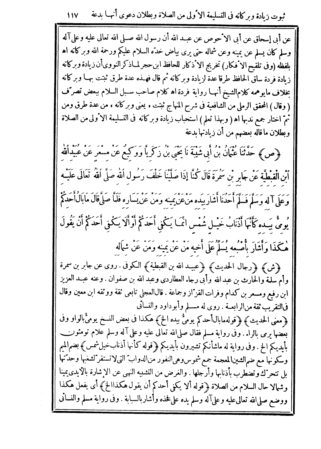 عن أبي إسحاق عن أبي الأحوص عن عبد الله أن رسول الله صلى الله تعالى عليه وعلى آله وسلم كان يسلم عن يمينه وعن شماله حتى يرى يياض خدّه السلام عليكم ورحمة الله وبركاته اهـ