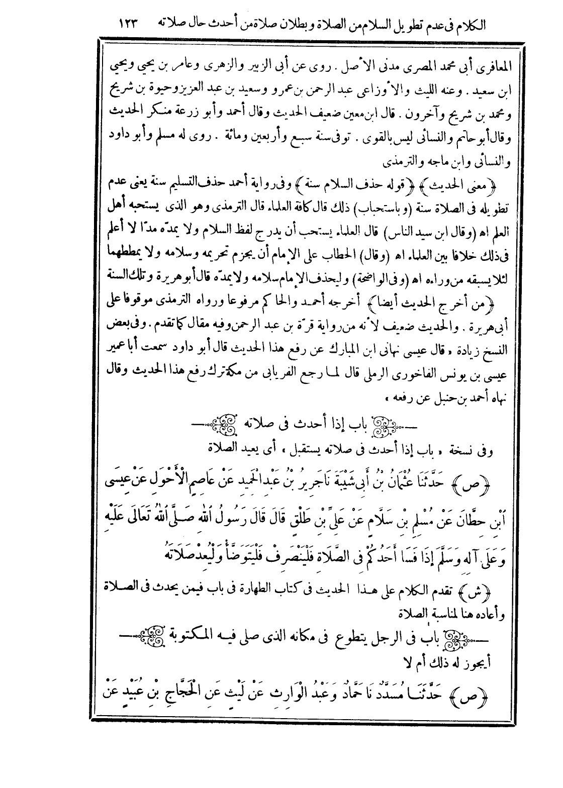 (ص) حَدَّثَنَا عُثْمَانُ بْنُ أَبِي شَيْبَةَ نَا جَرِيرُ بْنُ عَبْدِ الْحَمِيدِ عَنْ عَاصِمٍ الأَحْوَلِ عَنْ عِيسَى بْنِ حِطَّانَ عَنْ مُسْلِمِ بْنِ سَلاَّمٍ عَنْ عَلِيِّ بْنِ طَلْقٍ قَالَ قَالَ رَسُولُ اللهِ -صَلَّى الله تَعَالَى عَلَيْهِ وَعَلَى آلِهِ وَسَلَّمَ- "إِذَا فَسَا أَحَدُكُمْ في الصَّلاَةِ فَلْيَنْصَرِفْ فَلْيَتَوَضَّأْ وَلْيُعِدْ صَلاَتَهُ".