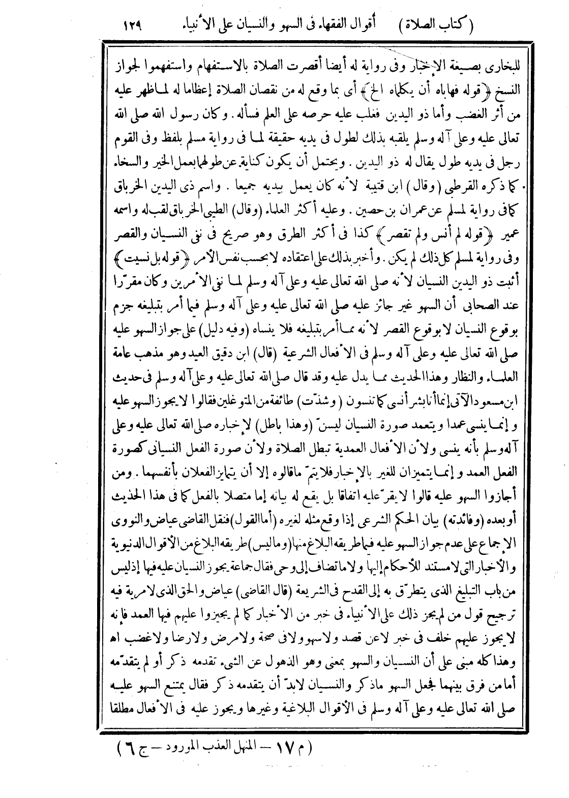 (قوله بل نسيت) أثبت ذو اليدين النسيان لأنه صلى الله تعالى عليه وعلى آله وسلم لما نفى الأمرين وكان مقرّرًا عند الصحابي أن السهو غير جائز عليه صلى الله تعالى عليه وعلى آله وسلم فيما أمر بتبليغه جزم بوقوع النسيان لا بوقوع القصر لأنه مما أمر بتبليغه فلا ينساه (وفيه دليل) على جواز السهو عليه صلى الله تعالى عليه وعلى آله وسلم في الأفعال الشرعية (قال) ابن دقيق العيد وهو مذهب عامة العلماء والنظار وهذا الحديث مما يدل عليه وقد قال صلى الله تعالى عليه وعلى آله وسلم في حديث ابن مسعود الآتي إنما أنا بشر أنسى كما تنسون (وشذّت) طائفة من المتوغلين فقالو لا يجوز السهو عليه وإنما ينسى عمدًا ويتعمد صورة النسيان ليسنّ (وهذا باطل) لإخباره صلى الله تعالى عليه وعلى آله وسلم بأنه ينسى ولأن الأفعال العمدية تبطل الصلاة ولأن صورة الفعل النسياني كصورة الفعل العمد وإنما يتميزان للغير بالإخبار فلا يتمّ ما قالوه إلا أن يتمايز الفعلًان بأنفسهما. ومن أجازوا السهو عليه قالوا لا يقرّ عليه اتفاقًا بل يقع له بيانه إما متصلًا بالفعل كما في هذا الحديث أوبعده (وفائدته) بيان الحكم الشرعى إذا وقع مثله لغيره (أما القول) فنقل القاضي عياض والنووي الإجماع على عدم جواز السهو عليه فيما طريقه البلاغ منها (وما ليس) طر يقه البلاغ من الأقوال الدنيوية والأخبار التي لا مستند الأحكام إليها ولا ما تضاف إلى وحي فقال جماعة يجوز النسيان عليه فيها إذ ليس من باب التبليغ الذي يتطرّق به إلى القدح في الشريعة (قال القاضي) عياض والحق الذي لا مرية فيه ترجيح قول من لم يجز ذلك على الأنبياء في خبر من الأخبار كما لم يجيزوا عليهم فيها العمد فإنه لا يجوز عليهم خلف في خبر لا عن قصد ولا سهو ولافى صحة ولا مرض ولا رضا ولا غضب اهـ