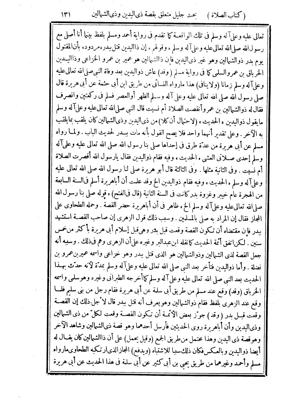 تعالى عليه وعلى آله وسلم في تلك الواقعة كما تقدم في رواية أحمد ومسلم بلفظ بينما أنا أصلي مع رسول الله صلى الله تعالى عليه وعلى آله وسلم "وقولهم" إن ذا اليدين قتل ببدر "مردود" بأن المقتول يوم بدر ذو الشمالين وهو غير ذى اليدين فإن ذا الشمالين هو عمير بن عمرو الخزاعي وذا اليدين الخرباق بن عمرو السلمي كما في رواية مسلم (وقد) عاش ذو اليدين بعد وفاة النبي صلى الله تعالى عليه وعلى آله وسلم زمانًا (ولا ينافي) هذا ما رواه النسائي من طريق ابن أبي حثمة عن أبي هريرة قال صلى رسول الله صلى الله تعالى عليه وعلى آله وسلم الظهر أو العصر فسلم في ركعتين وانصرف فقال له ذو الشمالين بن عمرو أنقصت من الصلاة أم نسيت قال النبي صلى الله تعالى عليه وعلى آله وسلم ما يقول ذو اليدين "الحديث" (لاحتمال أن كلا) من ذى اليدين وذى الشمالين كان يلقب بما يلقب به الآخر. وعلى تقدير أنهما واحد فلا يصح القول بأنه مات ببدر لحديث الباب. ولما رواه مسلم عن أبي هريرة من عدّة طرق في إحداها صلى بنا رسول الله صلى الله تعالى عليه وعلى آله وسلم إحدى صلاتي العشي "الحديث" وفيه فقام ذو اليدين فقال يا رسول الله أقصرت الصلاة أم نسيت. وفي الثانية مثلها. وفي الثالثة قال أبوهريرة صلى لنا رسول الله صلى الله تعالى عليه وعلى آله وسلم "الحديث" وفيه فقام ذوا اليدين الخ وقد علمت أن أبا هريرة أسلم في السنة السابعة من الهجرة عام خيبر وغزوة بدر كانت في السنة الثانية (قال في الفتح) "قوله صلي بنا رسول الله صلى الله تعالى عليه وعلى آله وسلم الخ" ظاهر في أن أبا هريرة حضر القصة. وحمله الطحاوي على المجازر فقال إن المراد به صلى بالمسلمين. وسبب ذلك قول الزهري إن صاحبب القصة استشهد ببدر فإن مقتضاه أن تكون القصة وقعت قبل بدر وهي قبل إسلام أبي هريرة بأكثر من خمس سنين. لكن اتفق أئمة الحديث كما نقله ابن عبد البر وغيره على أن الزهري وهم في ذلك. وسببه أنه جعل القصة لذى الشمالين وذو الشمالين هو الذي قتل ببدر وهو خزاعي واسمه عمير بن عمرو بن نضلة. وأما ذو اليدين فتأخر بعد النبي صلى الله تعالى عليه وعلى آله وسلم بمدّة لأنه حدّث بهذا الحديث بعد النبي صلى الله تعالى عليه وعلى آله وسلم كما أخرجه الطبراني وغيره وهو سلمي واسمه الخرباق (وقد) وقع عند مسلم من طريق أبي سلمة عن أبي هريرة فقام رجل من بني سليم فلما وقع عند الزهري بلفظ فقام ذو الشمالين وهو يعرف أنه قتل ببدر قال لأجل. ذلك إن القصة وقعت قبل بدر (وقد) جوّز بعض الأئمة أن تكون القصة وقعت لكلّ من ذى الشمالين وذى اليدين وأن أبا هريرة روى الحديثين فأرسل أحدهما وهو قصة ذى الشمالين وشاهد الآخر وهو قصة ذى اليدين وهذا محتمل من طريق الجمع (وقيل يحمل) على أن ذا الشمالين كان يقال له أيضًا ذو اليدين وبالعكس فإن ذلك سببًا للاشتباه (ويدفع) المجاز الذي ارتكبه الطحاوي ما رواه مسلم وأحمد وغيرهما من طريق يحيى بن أبي كثير عن أبي سلمة في هذا الحديث عن أبي هريرة