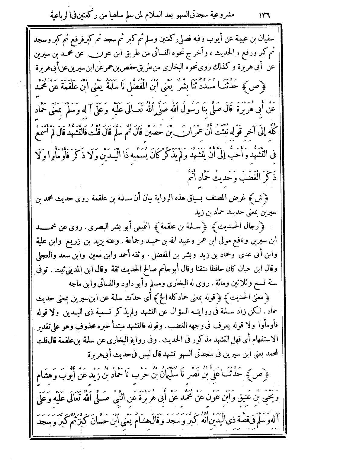 (ص) حَدَّثَنَا مُسَدَّدٌ نَا بِشْرٌ -يَعْنِي ابْنَ الْمُفَضَّلِ- نَا سَلَمَةُ -يَعْنِي ابْنَ عَلْقَمَةَ- عَنْ مُحَمَّدٍ عَنْ أَبِي هُرَيْرَةَ قَالَ صَلَّى بِنَا رَسُولُ اللَّهِ -صَلَّى الله تَعَالَى عَلَيْهِ وَعَلَى آلِهِ وَسَلَّمَ- بِمَعْنَى حَمَّادٍ كُلِّهِ إِلَى آخِرِ قَوْلِهِ نُبِّئْتُ أَنَّ عِمْرَانَ بْنَ حُصَيْنٍ قَالَ ثُمَّ سَلَّمَ. قَالَ قُلْتُ فَالتَّشَهُّدُ قَالَ لَمْ أَسْمَعْ فِي التَّشَهُّدِ وَأَحَبُّ إِلَيَّ أَنْ يَتَشَهَّدَ وَلَمْ يَذْكُرْ كَانَ يُسَمِّيهِ ذَا الْيَدَيْنِ. وَلاَ ذَكَرَ فَأَوْمَئُوا. وَلاَ ذَكَرَ الْغَضَبَ وَحَدِيثُ حَمَّادٍ أَتَمُّ.