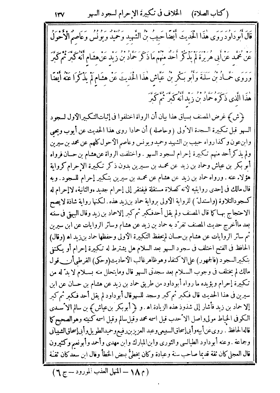 (ش) غرض المصنف بسياق هذا بيان أن الرواة اختلفوا في إثبات التكبير الأول لسجود السهو قبل تكبيرة السجدة الأولى (وحاصله) أن حمادًا روى هذا الحديث عن أيوب ويحيى وابن عون وكذا رواه حبيب بن الشهيد وحميد ويونس وعاصم الأحول كلهم عن محمَّد بن سيرين ولم يذكر أحد منهم تكبيرة الإحرام لسجود السهو. واختلفت الرواة عن هشام بن حسان فرواه أبو بكر بن عياش وحماد بن زيد عن محمَّد بن سيرين بدون ذكر تكبيرة الإحرام كرواية هؤلاء عنه. ورواه حماد بن زيد عن هشام عن محمَّد بن سيرين بتكبير إحرام للسجود. وبه قال مالك في إحدى روايتيه لأنه كصلاة مستقلة فيفتقر إلى إحرام جديد "والثانية" لا إحرام له كسجود التلاوة