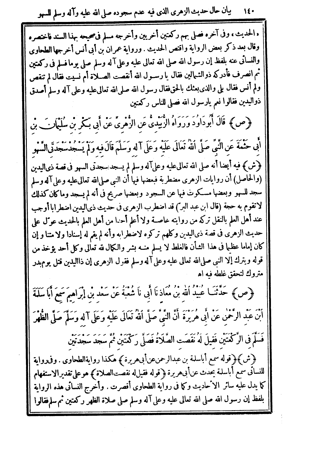 "الحديث" وفي آخره فصلى بهم ركعتين أخريين وأخرجه مسلم في صحيحه بهذا السند فاختصره وقال بعد ذكر بعض الرواية واقتص الحديث. ورواية عمران بن أبي أنس أخرجها الطحاوي والنسائي عنه بلفظ إن رسول الله صلى الله تعالى عليه وعلى آله وسلم صلى يوما فسلم في ركعتين ثم انصرف فأدركه ذو الشمالين فقال يا رسول الله أنقصت الصلاة أم نسيت فقال لم تنقص ولم أنس فقال بلى والذي بعثك بالحق فقال رسول الله صلى الله تعالى عليه وعلى آله وسلم أصدق ذو اليدين فقالوا نعم يا رسول الله فصلى للناس ركعتين