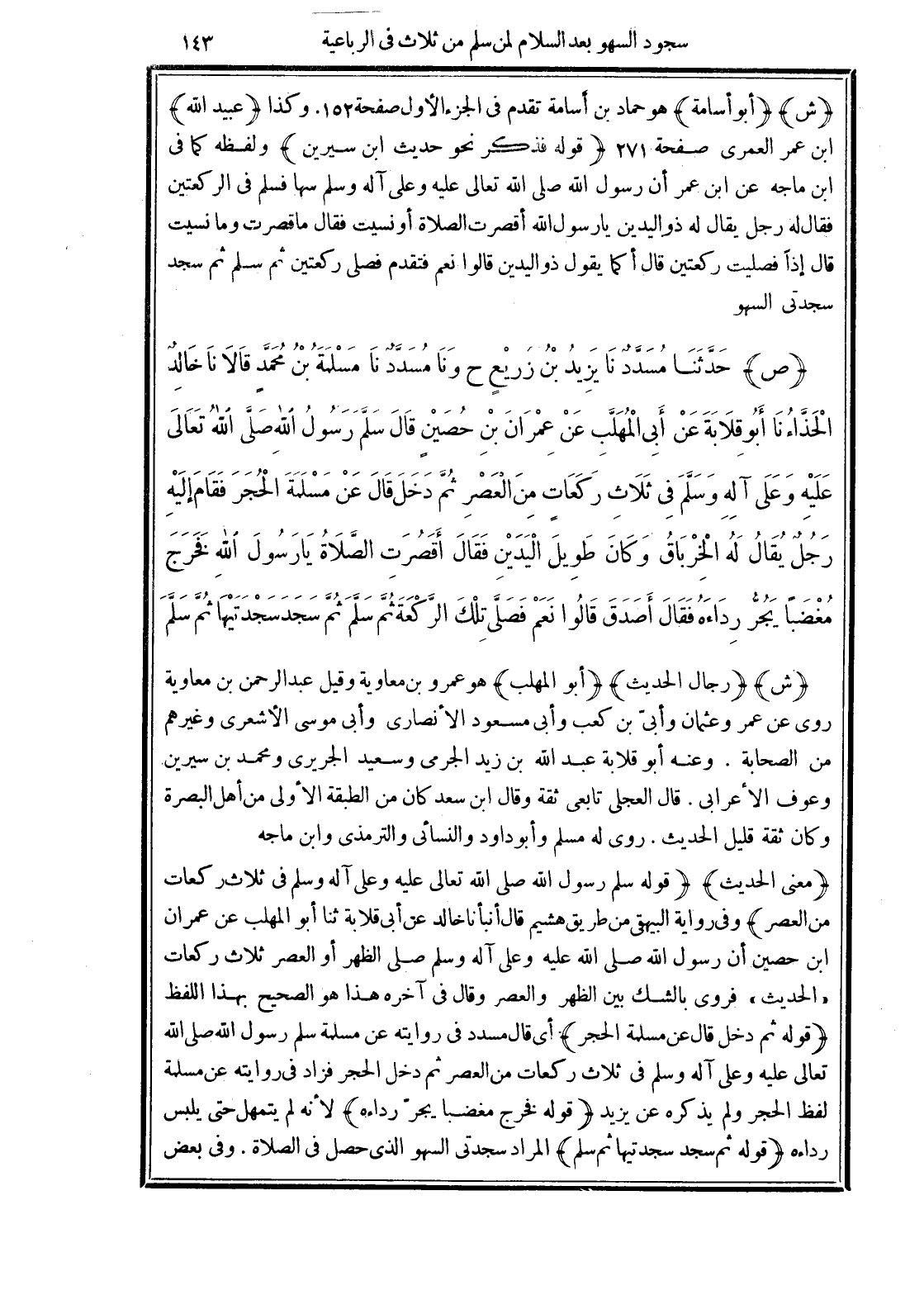 (ص) حَدَّثَنَا مُسَدَّدٌ نَا يَزِيدُ بْنُ زُرَيْعٍ ح وَنَا مُسَدَّدٌ نَا مَسْلَمَةُ بْنُ مُحَمَّدٍ قَالَ نَا خَالِدٌ الْحَذَّاءُ نَا أَبُو قِلاَبَةَ عَنْ أَبِي الْمُهَلَّبِ عَنْ عِمْرَانَ بْنِ حُصَيْنٍ قَالَ سَلَّمَ رَسُولُ اللهِ -صلي الله عليه وسلم- في ثَلاَثِ رَكَعَاتٍ مِنَ الْعَصْرِ ثُمَّ دَخَلَ -قَالَ عَنْ مَسْلَمَةَ- الْحُجَرَ فَقَامَ إِلَيْهِ رَجُلٌ يُقَالُ لَهُ الْخِرْبَاقُ كَانَ طَوِيلَ الْيَدَيْنِ فَقَالَ لَهُ أَقَصُرَتِ الصَّلاَةُ يَا رَسُولَ اللهِ فَخَرَجَ مُغْضَبًا يَجُرُّ رِدَاءَهُ فَقَالَ "أَصَدَقَ". قَالُوا نَعَمْ. فَصَلَّي تِلْكَ الرَّكْعَةَ ثُمَّ سَلَّمَ ثُمَّ سَجَدَ سَجْدَتَيْهَا ثُمَّ سَلَّمَ.