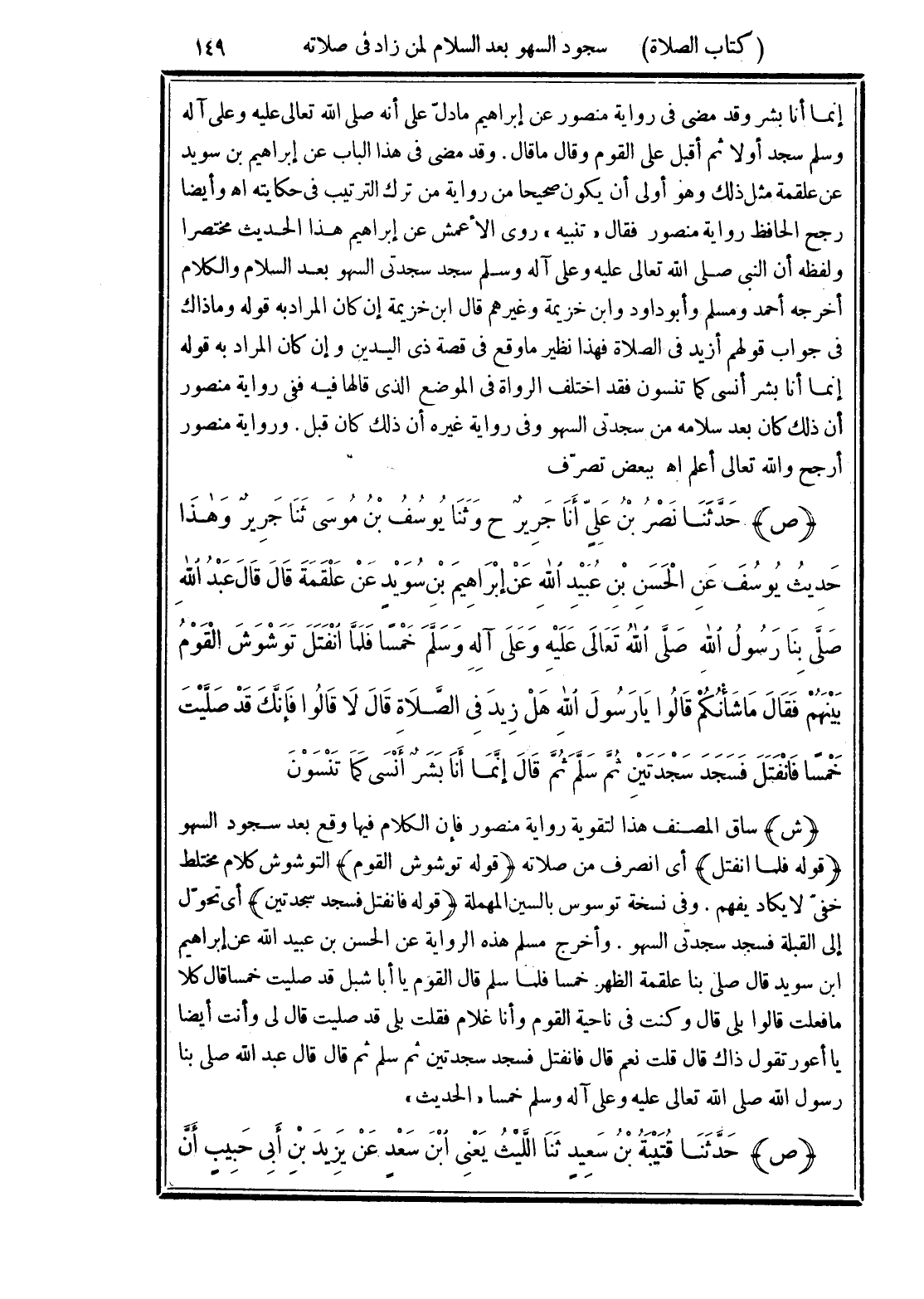 وأيضًا رجح الحافظ رواية منصور فقال "تنبيه" روي الأعمش عن إبراهيم هذا الحديث مختصرًا ولفظه أن النبي صلى الله تعالى عليه وعلى آله وسلم سجد سجدتي السهو بعد السلام والكلام أخرجه أحمد ومسلم وأبو داود وابن خزيمة وغيرها قال ابن خزيمة إن كان المراد به قوله وما ذاك في جواب قولهم أزيد في الصلاة فهذا نظير ما وقع في قصة ذي اليدين وإن كان المراد به قوله إنما أنا بشر أنسى كما تنسون فقد اختلف الرواة في الموضع الذي قالها فيه ففي رواية منصور أن ذلك كان بعد سلامه من سجدتي السهو وفي رواية غيره أن ذلك كان قبل. ورواية منصور أرجح والله تعالى أعلم اهـ ببعض تصرّف