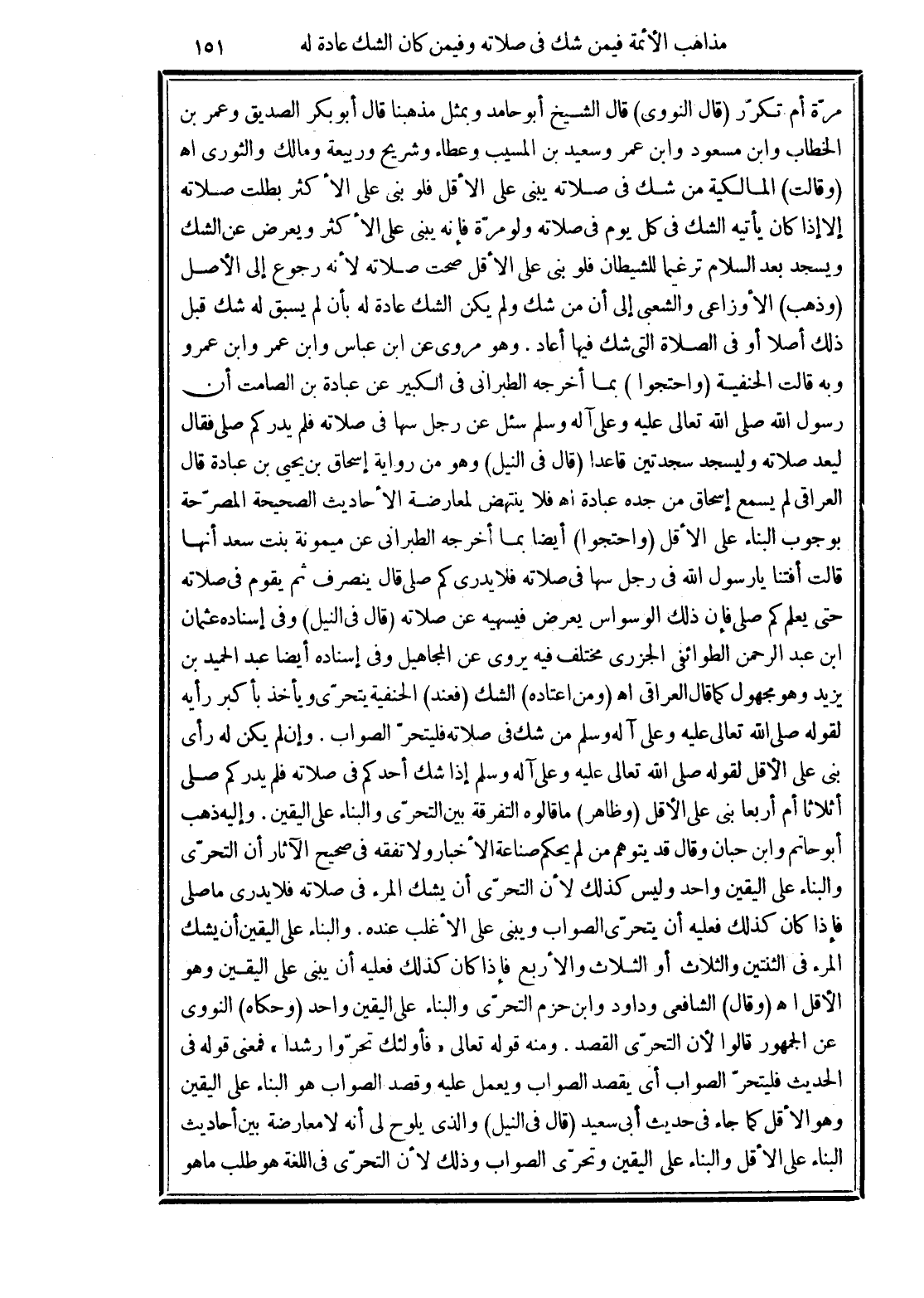 (ومن اعتاده) الشك (فعند) الحنفية يتحرّي ويأخذ بأكبر رأيه لقوله صلى الله تعالى عليه وعلى آله وسلم من شك في صلاته فليتحرّ الصواب. وإن لم يكن له رأي بنى على الأقل لقوله صلى الله تعالى عليه وعلى آله وسلم إذا شك أحدكم في صلاته فلم يدر كم صلى أثلاثا أم أربعًا بنى على الأقل (وظاهر) ما قالوه التفرقة بين التحرّي والبناء على اليقين. وإليه ذهب أبو حاتم وابن حبان وقال قد يتوهم من لم يحكم صناعة الأخبار ولا تفقه في صحيح الآثار أن التحرّي والبناء على اليقين واحد وليس كذلك لأن التحرّي أن يشك المرء في صلاته فلا يدري ما صلى فإذا كان كذلك فعليه أن يتحرّي الصواب ويبني على الأغلب عنده. والبناء على اليقين أن يشك المرء في الثنتين والثلاث أو الثلاث والأربع فإذا كان كذلك فعليه أن يبني على اليقين وهو الأقل اهـ