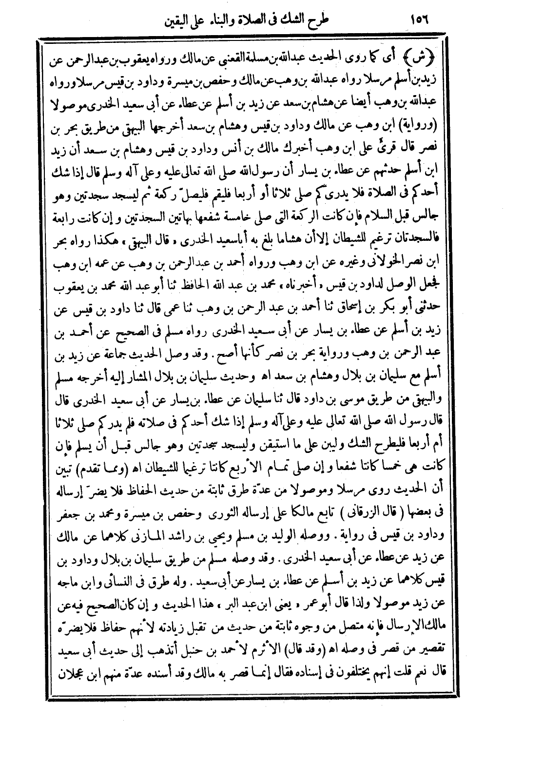 (ورواية) ابن وهب عن مالك وداود بن قيس وهشام بن سعد أخرجها البيهقي من طريق بحر بن نصر قال قرئَ على ابن وهب أخبرك مالك بن أنس وداود بن قيس وهشام بن سعد أن زيد ابن أسلم حدثهم عن عطاء بن يسار أن رسول الله صلى الله تعالى عليه وعلى آله وسلم قال إذا شك أحدكم في الصلاة فلا يدري كم صلى ثلاثًا أو أربعًا فليقم فليصلّ ركعة ثم ليسجد سجدتين وهو جالس قبل السلام فإن كانت الركعة التي صلى خامسة شفعها بهاتين السجدتين وإن كانت رابعة فالسجدتان ترغيم للشيطان إلا أن هشامًا بلغ به أبا سعيد الخدري "قال البيهقي" هكذا رواه بحر ابن نصر الخولاني وغيره عن ابن وهب ورواه أحمد بن عبد الرحمن بن وهب عن عمه ابن وهب فجعل الوصل لداود بن قيس "أخبرناه" محمَّد بن عبد الله الحافظ ثنا أبو عبد الله محمَّد بن يعقوب حدثني أبو بكر بن إسحاق ثنا أحمد بن عبد الرحمن بن وهب ثنا عمي قال ثنا داود بن قيس عن زيد بن أسلم عن عطاء بن يسار عن أبي سعيد الخدري رواه مسلم في الصحيح عن أحمد بن عبد الرحمن بن وهب ورواية بحر بن نصر كأنها أصح. وقد وصل الحديث جماعة عن زيد بن أسلم مع سليمان بن بلال وهشام بن سعد اهـ