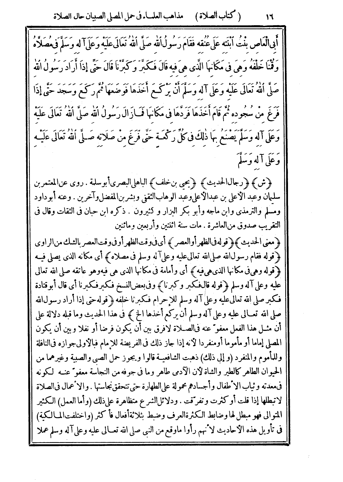 بِنْتُ أَبِي الْعَاصِ بِنْتُ ابْنَتِهِ عَلَى عُنُقِهِ فَقَامَ رَسُولُ اللَّهِ -صلى الله عليه وسلم- فِى مُصَلاَّهُ وَقُمْنَا خَلْفَهُ وَهِىَ فِى مَكَانِهَا الَّذِى هِىَ فِيهِ قَالَ فَكَبَّرَ فَكَبَّرْنَا قَالَ حَتَّى إِذَا أَرَادَ رَسُولُ اللَّهِ -صلى الله عليه وسلم- أَنْ يَرْكَعَ أَخَذَهَا فَوَضَعَهَا ثُمَّ رَكَعَ وَسَجَدَ حَتَّى إِذَا فَرَغَ مِنْ سُجُودِهِ ثُمَّ قَامَ أَخَذَهَا فَرَدَّهَا فِى مَكَانِهَا فَمَا زَالَ رَسُولُ اللَّهِ صلى الله تعالى عليه وعلى آله وسلم يَصْنَعُ بِهَا ذَلِكَ فِى كُلِّ رَكْعَةٍ حَتَّى فَرَغَ مِنْ صَلاَتِهِ صلى الله تعالى عليه وعلى آله وسلم.
