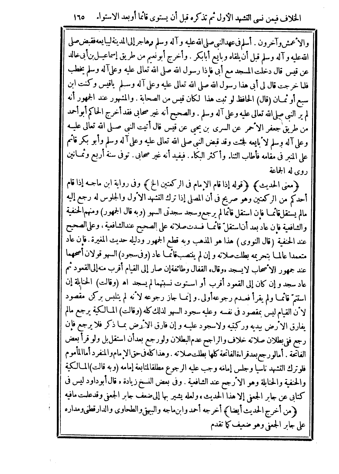 (وقالت) المالكية يرجع ما لم يفارق الأرض بيديه وركبتيه ولا سجود عليه وإن فارق الأرض بما ذكر فلا يرجع فإن رجع ففي بطلان صلاته خلاف والراجح عدم البطلان ولو رجع بعد أن استقل بل ولو قرأ بعض الفاتحة. أما لو رجع بعد قراءة الفاتحة كلها بطلت صلاته. وهذا كله في حق الإِمام والمنفرد أما المأموم فلو ترك التشهد ناسيًا وجلس إمامه وجب عليه الرجوع مطلقًا لمتابعة إمامه (وبه قالت) المالكية والحنفية والحنابلة وهو الأرجح عند الشافعية. وفي بعض النسخ زيادة "قال أبو داود ليس في كتابي عن جابر الجعفي إلا هذا الحديث" ولعله يشير بها إلى ضعف جابر الجعفي وقد علمت ما فيه