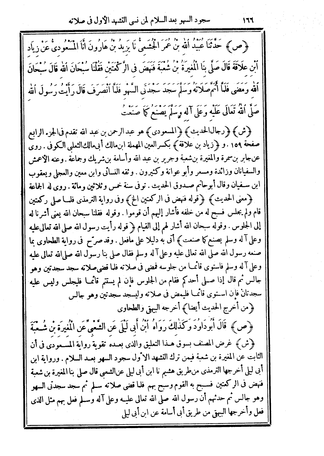 ورواية ابن أبي ليلي أخرجها الترمذي من طريق هشيم نا ابن ليلى عن الشعبي قال صلى بنا المغيرة بن شعبة فنهض في الركعتين فسبح به القوم وسبح بهم فلما قضى صلاته سلم ثم سجد سجدتي السهو وهو جالس ثم حدثهم أن رسول الله صلى الله تعالى عليه وعلى آله وسلم فعل بهم مثل الذي فعل وأخرجها البيهقي من طريق أبي أسامة عن ابن أبي ليلى