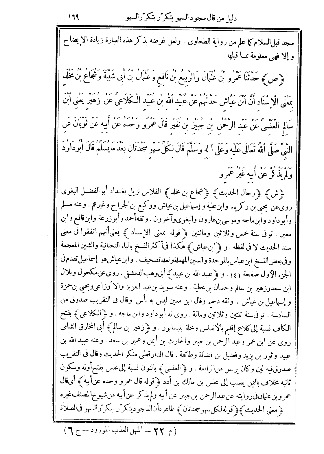 (ص) حَدَّثَنَا عَمْرُو بْنُ عُثْمَانَ وَالرَّبِيعُ بْنُ نَافِعٍ وَعُثْمَانُ بْنُ أَبِي شَيْبَةَ وَشُجَاعُ بْنُ مَخْلَدٍ -بِمَعْنَي الإِسْنَادِ- أَنَّ ابْنَ عَيَّاشٍ حَدَّثَهُمْ عَنْ عُبَيْدِ اللهِ بْنِ عُبَيْدٍ الْكَلاَعِيِّ عَنْ زُهَيْرٍ -يَعْنِي ابْنَ سَالِمٍ الْعَنْسِيِّ- عَنْ عَبْدِ الرَّحْمَنِ بْنِ جُبَيْرِ بْنِ نُفَيْرٍ قَالَ عَمْرٌو وَحْدَهُ عَنْ أَبِيهِ عَنْ ثَوْبَانَ عَنِ النَّبِيِّ -صَلَّى الله تَعَالَى عَلَيْهِ وَعَلَى آلِهِ وَسَلَّمَ- قَالَ "لِكُلِّ سَهْوٍ سَجْدَتَانِ بَعْدَ مَا يُسَلِّمُ". لَمْ يَذْكُرْ عَنْ أَبِيهِ. غَيْرُ عَمْرٍو.