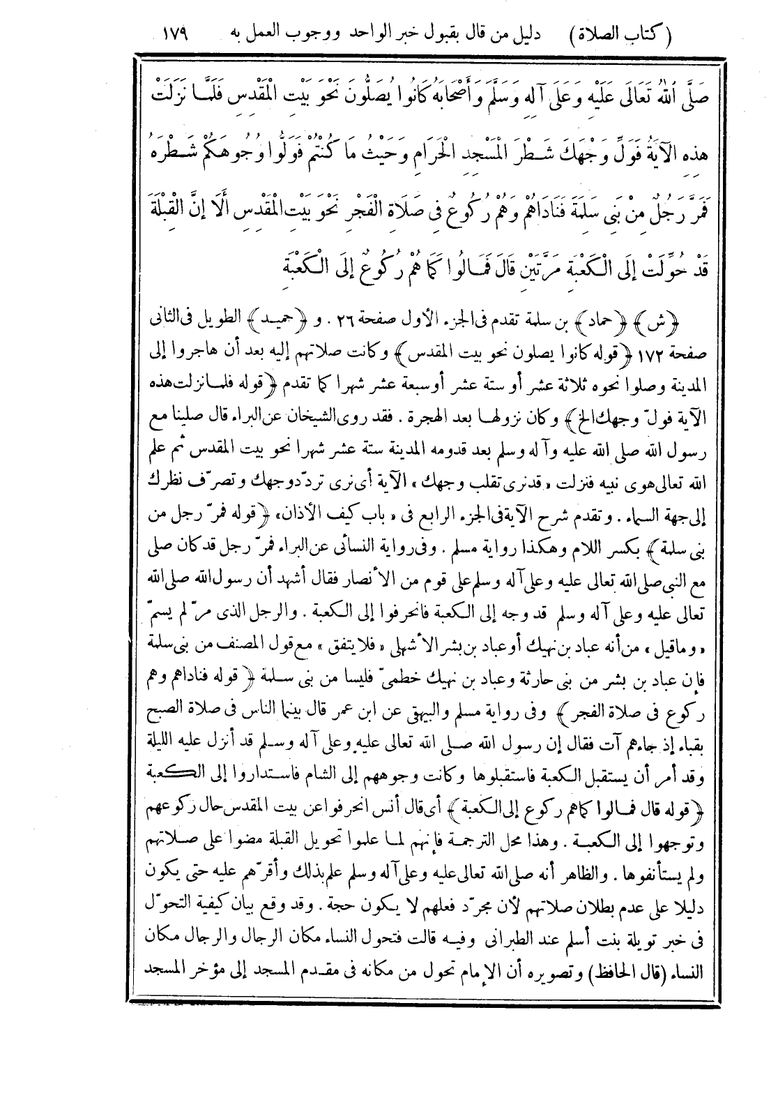 -صَلَّى الله تَعَالَى عَلَيْهِ وَعَلَى آلِهِ وَسَلَّمَ- وَأَصْحَابَهُ كَانُوا يُصَلُّونَ نَحْوَ بَيْتِ الْمَقْدِسِ فَلَمَّا نَزَلَتْ هَذِهِ الآيَةُ {فَوَلِّ وَجْهَكَ شَطْرَ الْمَسْجِدِ الْحَرَامِ وَحَيْثُ مَا كُنْتُمْ فَوَلُّوا وُجُوهَكُمْ شَطْرَهُ} فَمَرَّ رَجُلٌ مِنْ بَنِي سَلِمَةَ فَنَادَاهُمْ وَهُمْ رُكُوعٌ فِي صَلاَةِ الْفَجْرِ نَحْوَ بَيْتِ الْمَقْدِسِ أَلاَ إِنَّ الْقِبْلَةَ قَدْ حُوِّلَتْ إِلَى الْكَعْبَةِ مَرَّتَيْنِ فَمَالُوا كَمَا هُمْ رُكُوعٌ إِلَى الْكَعْبَةِ.