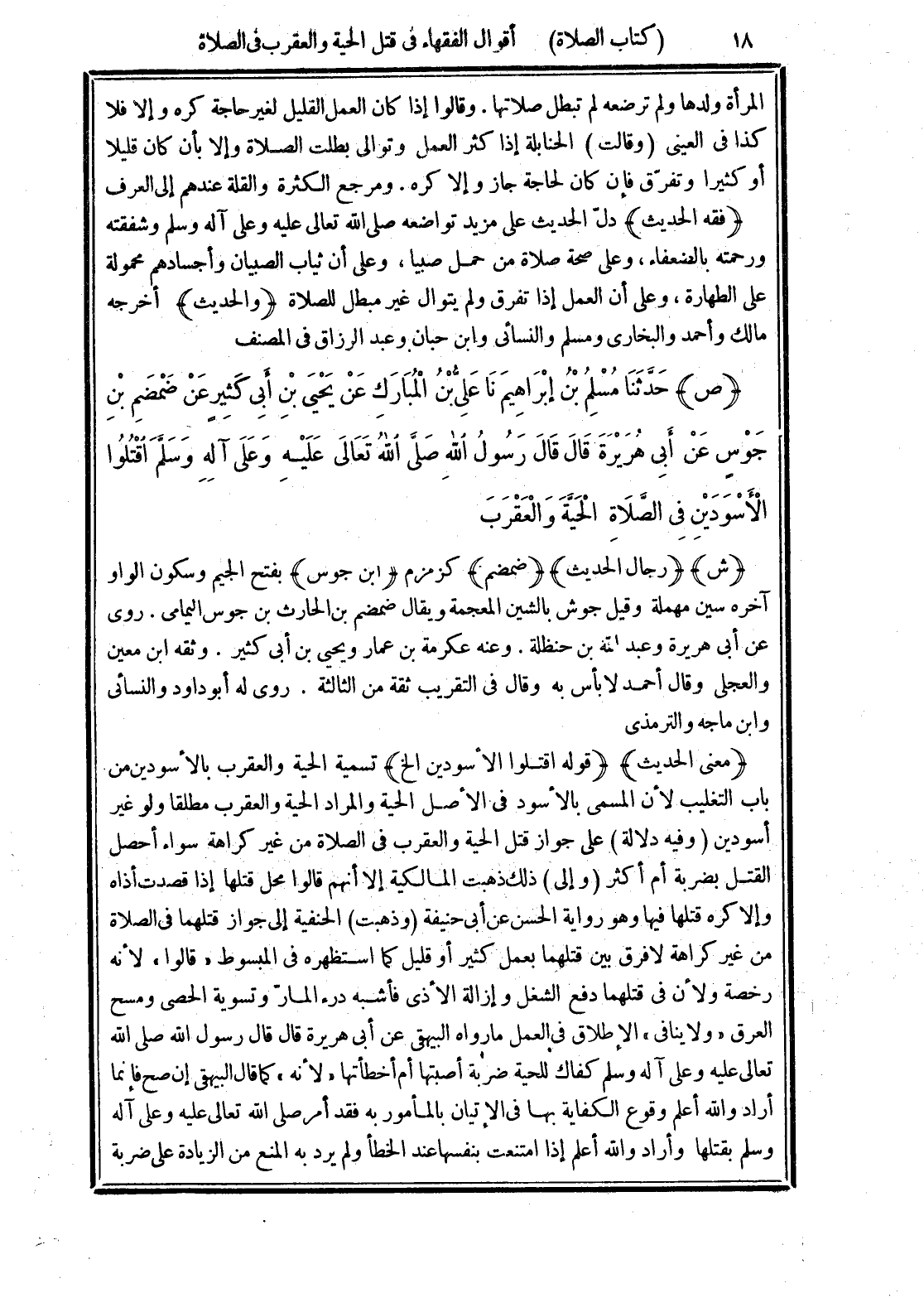 (ص) حَدَّثَنَا مُسْلِمُ بْنُ إِبْرَاهِيمَ نَا عَلِيُّ بْنُ الْمُبَارَكِ عَنْ يَحْيَى بْنِ أَبِي كَثِيرٍ عَنْ ضَمْضَمِ بْنِ جَوْسٍ عَنْ أَبِي هُرَيْرَةَ قَالَ قَالَ رَسُولُ اللهِ صلى الله تعالى عليه وعلى آله وسلم "اقْتُلُوا الأَسْوَدَيْنِ في الصَّلاَةِ الْحَيَّةَ وَالْعَقْرَبَ".