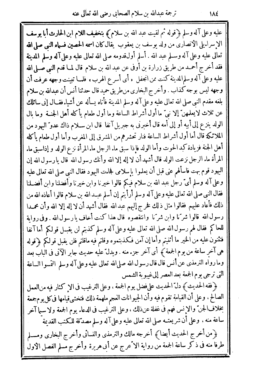 (قوله ثم لقيت عبد الله بن سلام) بتخفيف اللام ابن الحارث أبا يوسف الإسراءيلي الأنصاري من ولد يوسف بن يعقوب يقال كان اسمه الحصين فسماه النبي صلى الله تعالى عليه وعلى آله وسلم عبد الله. أسلم أول قدومه صلى الله تعالى عليه وعلى آله وسلم المدينة فقد أخرج أحمد من طريق زرارة بن أوفي عن عبد الله بن سلام قال لما قدم النبي صلى الله عليه وعلى آله وسلم المدينة كمت ممن انجفل "أي أسرع الهرب" فلما تبينت وجهه عرفت أن وجهه ليس بوجه كذاب. وأخرج البخاري من طريق حميد قال حدثنا أنس أن عبد الله بن سلام بلغه مقدم النبي صلى الله تعالى عليه وعلى آله وسلم المدينة فأتاه يسأله عن أشياء فقال إني سائلك عن ثلاث لا يعلمهنّ إلا نبيّ ما أول أشراط الساعة وما أول طعام يأكله أهل الجنة وما بال الولد ينزع إلى أبيه أو إلى أمه قال أخبرني به جبريل آنفًا قال ابن سلام ذاك عدوّ اليهود من الملائكة قال أما أول أشراط الساعة فنار تحشرهم من المشرق إلى المغرب وأما أول طعام يأكله أهل الجنة فزيادة كبد الحوت وأما الولد فإذا سبق ماء الرجل ماء المرأة نزع الولد وإذا سبق ماء المرأة ماء الرجل نزعت الولد قال أشهد أن لا إله إلا الله وأنك رسول الله قال يا رسول الله إن اليهود قوم بهت فاسألهم عني قبل أن يعلموا بإسلامي فجاءت اليهود فقال النبي صلى الله تعالى عليه وعلى آله وسلم أيّ رجل عبد الله بن سلام فيكم قالوا خيرنا وابن خيرنا وأفضلنا وابن أفضلنا فقال النبي صلى الله تعالى عليه وعلى آله وسلم أرأيتم إن أسلم عبد الله بن سلام قالوا أعاذه الله من ذلك فأعاد عليهم فقالوا مثل ذلك فخرج إليهم عبد الله فقال أشهد أن لا إله إلا الله وأن محمدًا رسول الله قالوا شّرنا وابن شرّنا وانتقصوه قال هذا كنت أخاف يا رسول الله. وفي رواية للحاكم فقال لهم رسول الله صلى الله تعالى عليه وعلى آله وسلم كذبتم لن يقبل قولكم أما آنفًا فتثنون عليه من الخير ما أثنيتم وأما إن آمن فكذبتموه وقلتم فيه ما قلتم فلن يقبل قولكم