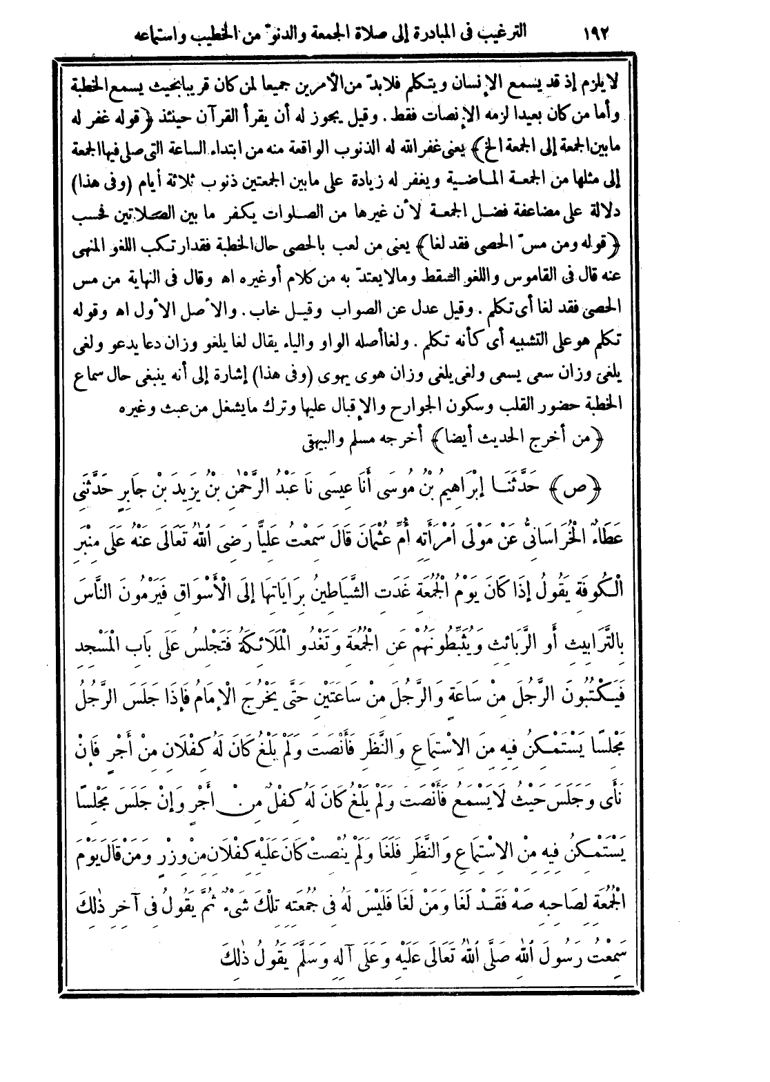 لايلزم إذ قد سمع الإنسان ويتكلم فلا بدّ من الأمرين جميعًا لمن كان قريبًا بحيث يسمع الخطبة وأما من كان بعيدًا لزمه الإنصاف فقط. وقيل يجوز له أن يقرأ القرآن حينئذ