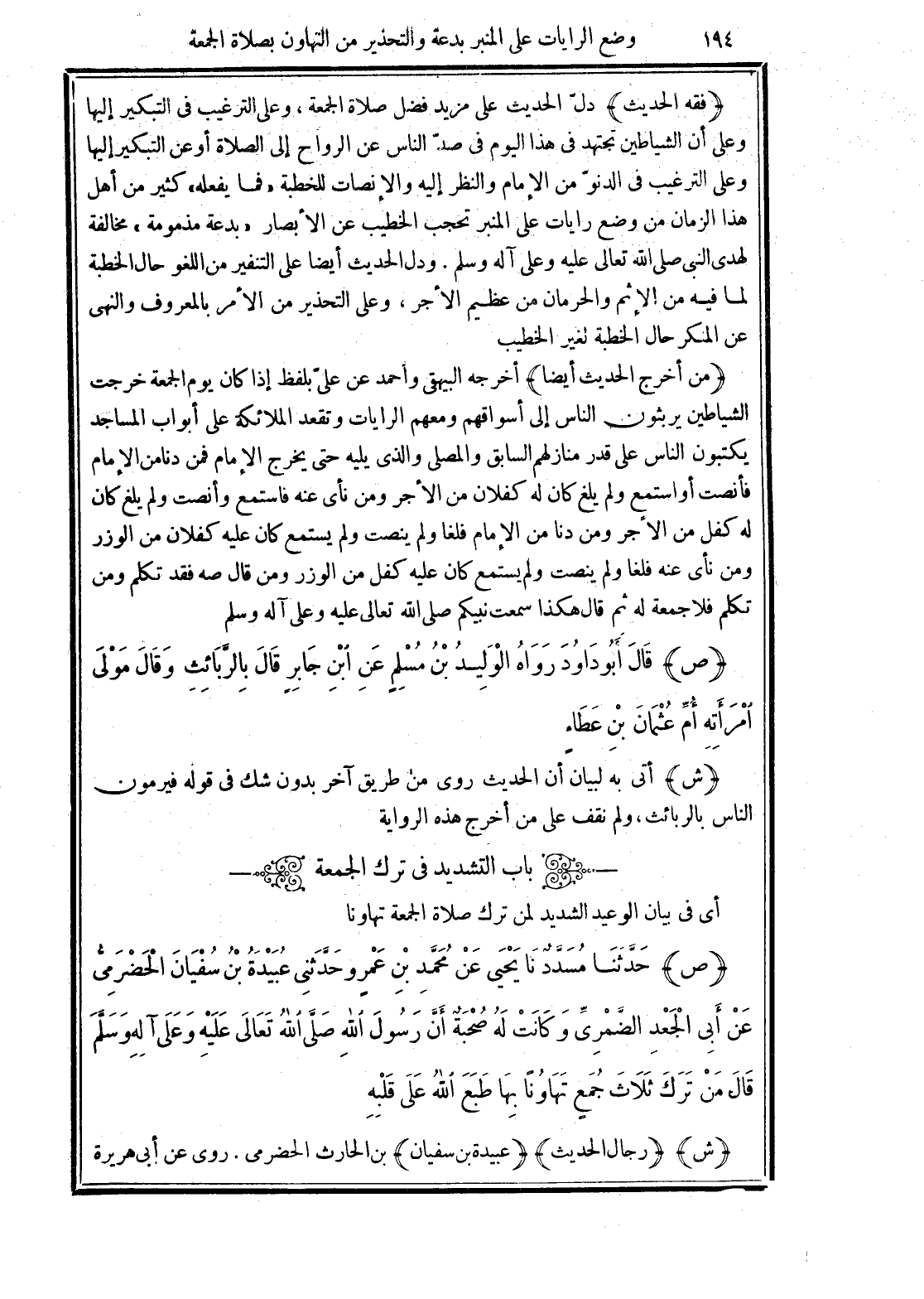 (ص) حَدَّثَنَا مُسَدَّدٌ نَا يَحْيَى عَنْ مُحَمَّدِ بْنِ عَمْرٍو قَالَ حَدَّثَنِي عُبَيْدَةُ بْنُ سُفْيَانَ الْحَضْرَمِيُّ عَنْ أَبِي الْجَعْدِ الضَّمْرِيِّ -وَكَانَتْ لَهُ صُحْبَةٌ- أَنَّ رَسُولَ اللهِ -صَلَّى الله تَعَالَى عَلَيْهِ وَعَلَى آلِهِ وَسَلَّمَ- قَالَ "مَنْ تَرَكَ ثَلاَثَ جُمَعٍ تَهَاوُنًا بِهَا طَبَعَ الله عَلَي قَلْبِهِ".