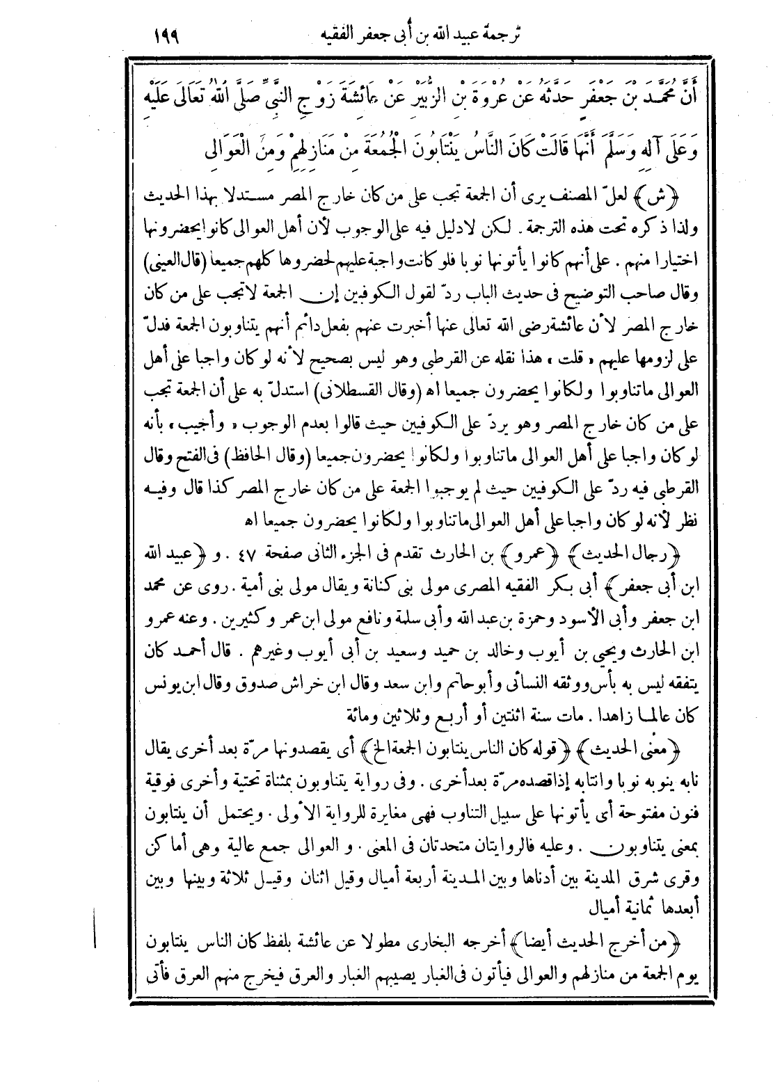 أَنَّ مُحَمَّدَ بْنَ جَعْفَرٍ حَدَّثَهُ عَنْ عُرْوَةَ بْنِ الزُّبَيْرِ عَنْ عَائِشَةَ زَوْجِ النَّبِيِّ -صَلَّى الله تَعَالَى عَلَيْهِ وَعَلَى آلِهِ وَسَلَّمَ- أَنَّهَا قَالَتْ كَانَ النَّاسُ يَنْتَابُونَ الْجُمُعَةَ مِنْ مَنَازِلِهِمْ وَمِنَ الْعَوَالِي.