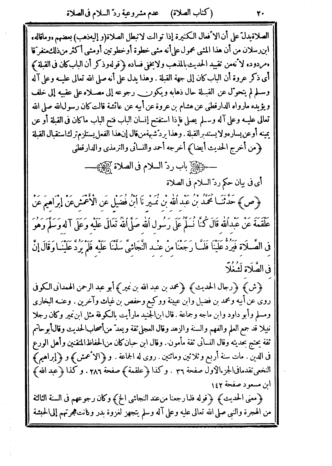 (ص) حَدَّثَنَا مُحَمَّدُ بْنُ عَبْدِ اللهِ بْنِ نُمَيْرٍ نَا ابْنُ فُضَيْلٍ عَنِ الأَعْمَشِ عَنْ إِبْرَاهِيمَ عَنْ عَلْقَمَةَ عَنْ عَبْدِ اللهِ قَالَ كُنَّا نُسَلِّمُ عَلَى رَسُولِ اللهِ -صلى الله عليه وسلم- وَهُوَ في الصَّلاَةِ فَيَرُدُّ عَلَيْنَا فَلَمَّا رَجَعْنَا مِنْ عِنْدِ النَّجَاشِيِّ سَلَّمْنَا عَلَيْهِ فَلَمْ يَرُدَّ عَلَيْنَا وَقَالَ "إِنَّ في الصَّلاَةِ لَشُغْلًا".