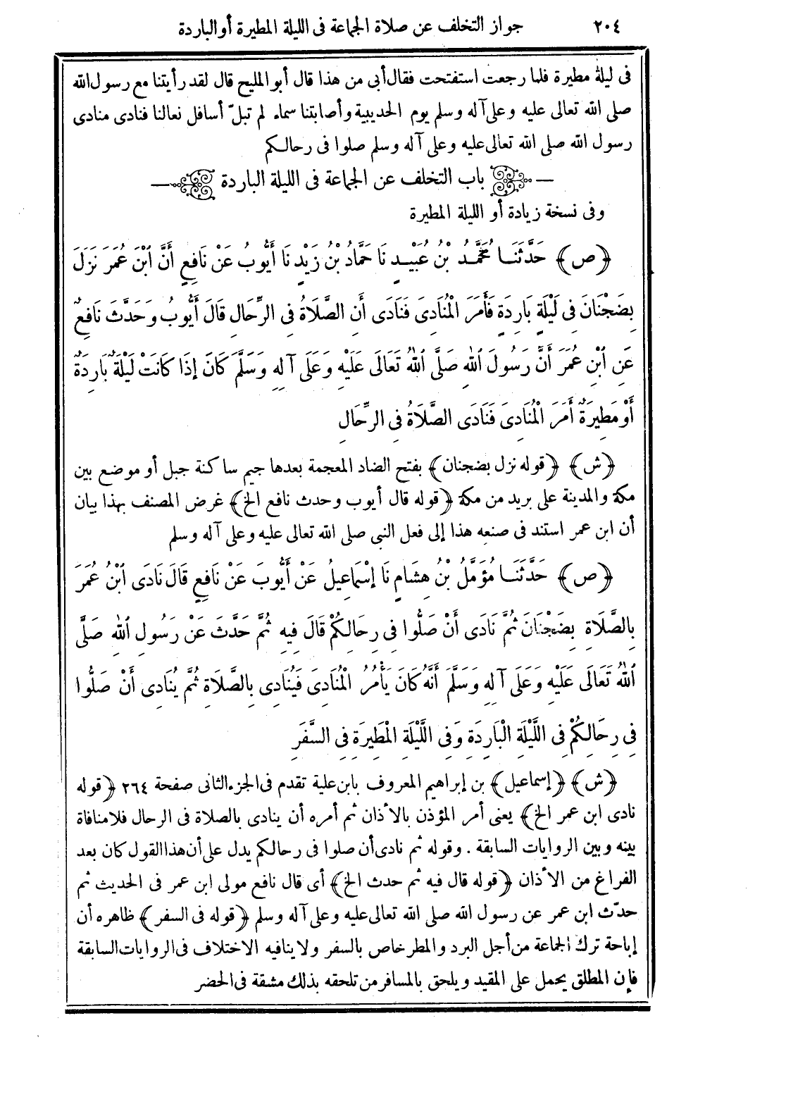 (ص) حَدَّثَنَا مُحَمَّدُ بْنُ عُبَيْدٍ نَا حَمَّادُ بْنُ زَيْدٍ نَا أَيُّوبُ عَنْ نَافِعٍ أَنَّ ابْنَ عُمَرَ نَزَلَ بِضَجْنَانَ في لَيْلَةٍ بَارِدَةٍ فَأَمَرَ الْمُنَادِيَ فَنَادَي أَنِ الصَّلاَةُ في الرِّحَالِ. قَالَ أَيُّوبُ وَحَدَّثَ نَافِعٌ عَنِ ابْنِ عُمَرَ أَنَّ رَسُولَ اللهِ -صَلَّى الله تَعَالَى عَلَيْهِ وَعَلَى آلِهِ وَسَلَّمَ- كَانَ إِذَا كَانَتْ لَيْلَةٌ بَارِدَةٌ أَوْ مَطِيرَةٌ أَمَرَ الْمُنَادِيَ فَنَادَي الصَّلاَةُ في الرِّحَالِ.