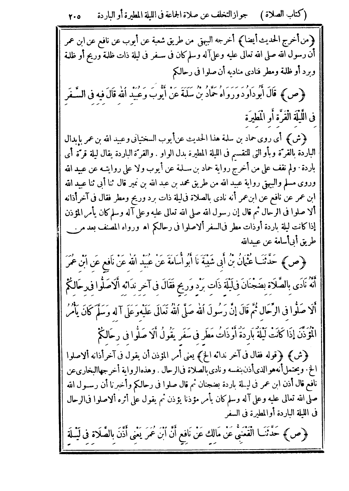 (من أخرج الحديث أيضًا) أخرجه البيهقي من طريق شعبة عن أيوب عن نافع عن ابن عمر أن رسول الله صلى الله تعالى عليه وعلى آله وسلم كان في سفر في ليلة ذات ظلمة وريح أو ظلمة وبرد أو ظلمة ومطر فنادي مناديه أن صلوا في رحالكم