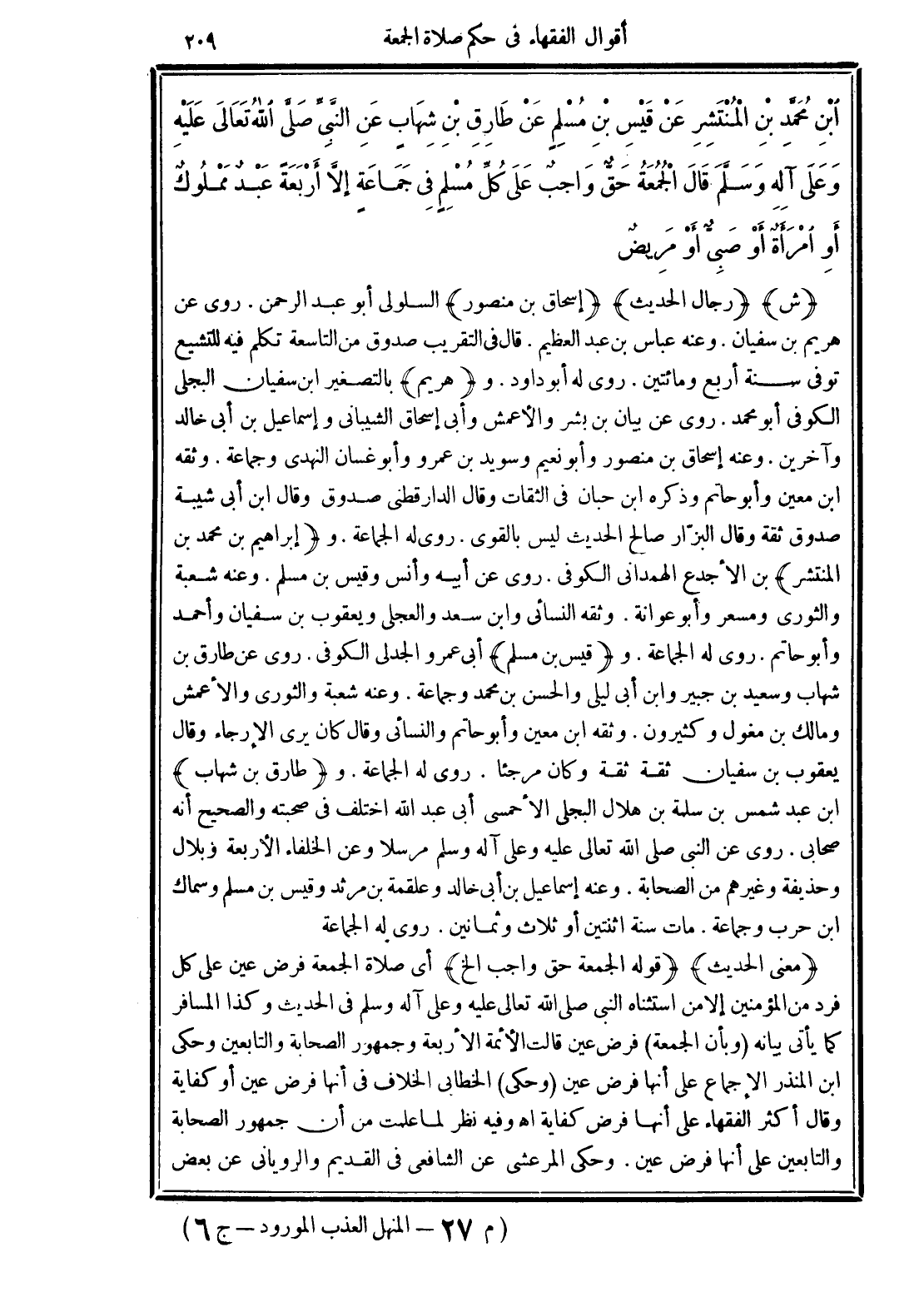 بْنِ مُحَمَّدِ بْنِ الْمُنْتَشِرِ عَنْ قَيْسِ بْنِ مُسْلِمٍ عَنْ طَارِقِ بْنِ شِهَابٍ عَنِ النَّبِيِّ -صَلَّى الله تَعَالَى عَلَيْهِ وَعَلَى آلِهِ وَسَلَّمَ- قَالَ "الْجُمُعَةُ حَقٌّ وَاجِبٌ عَلَي كُلِّ مُسْلِمٍ في جَمَاعَةٍ إِلاَّ أَرْبَعَةً عَبْدٌ مَمْلُوكٌ أَوِ امْرَأَةٌ أَوْ صَبِيٌّ أَوْ مَرِيضٌ".