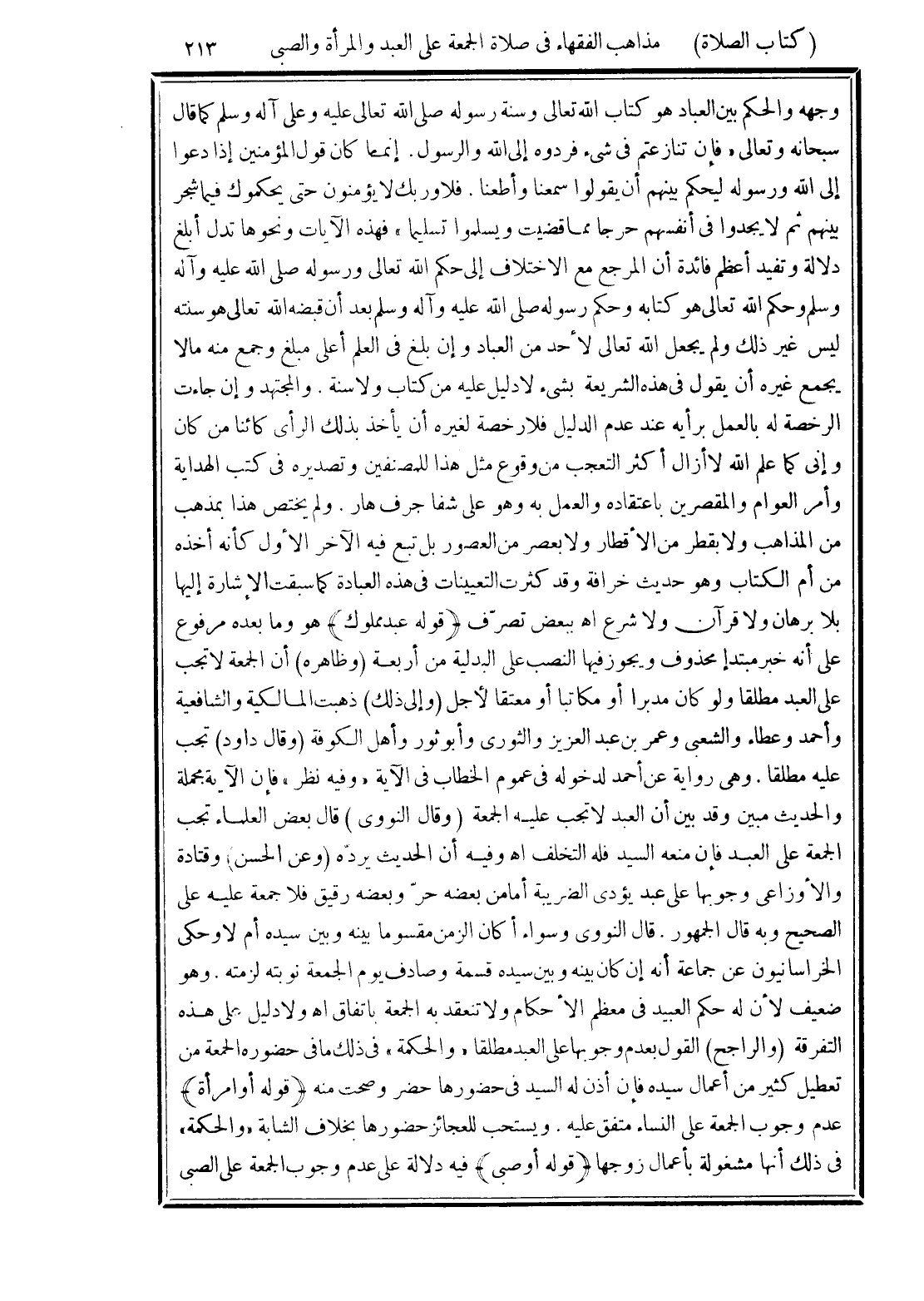 ولا دليل على هذه التفرقة (والراجح) القول بعدم وجوبها على العبد مطلقًا "والحكمة" في ذلك ما في حضوره الجمعة من تعطيل كثير من أعمال سيده فإن أذن له السيد في حضورها حضر وصحت منه